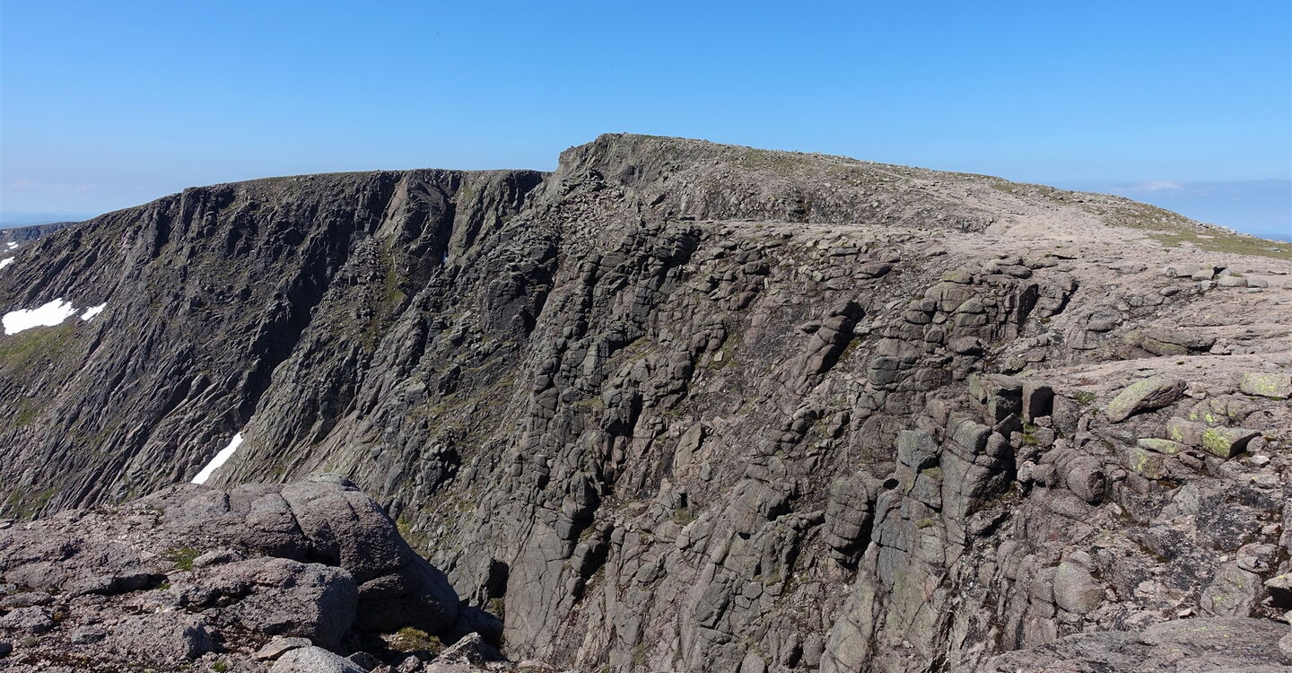 Bei einer ersten Weggabelung halten wir uns halb links und bei der nächsten gehen wir halb rechts. Auf dem nachfolgenden schmalen Grat sehen wir direkt vor uns die zerklüftete südliche Flanke des Gipfels. Der 04 Braeriach (1296 m) ist ein überragender Aussichtsberg. Zum Abstieg: Richtung Norden sehen wir in 250 m Entfernung einen vorgelagerten Hügel. Wir gehen nun weglos in nordwestliche Richtung leicht bergab durch den Hang dieses vorgelagerten Hügels, bis wir auf einen kleinen Bachlauf treffen. Wir befinden uns jetzt oberhalb einer nach Norden ausgerichteten Felswand mit einem dahinter liegenden Kar und dem tiefblauen Loch Corie an Lochhain. Oberhalb dieser steilen Felswand queren wir nun auf einem teilweise vorhandenen Pfad. Sobald wir den See hinter uns gelassen haben, steigen wir halb rechts in nordwestliche Richtung mittig auf dem Bergrücken ab.