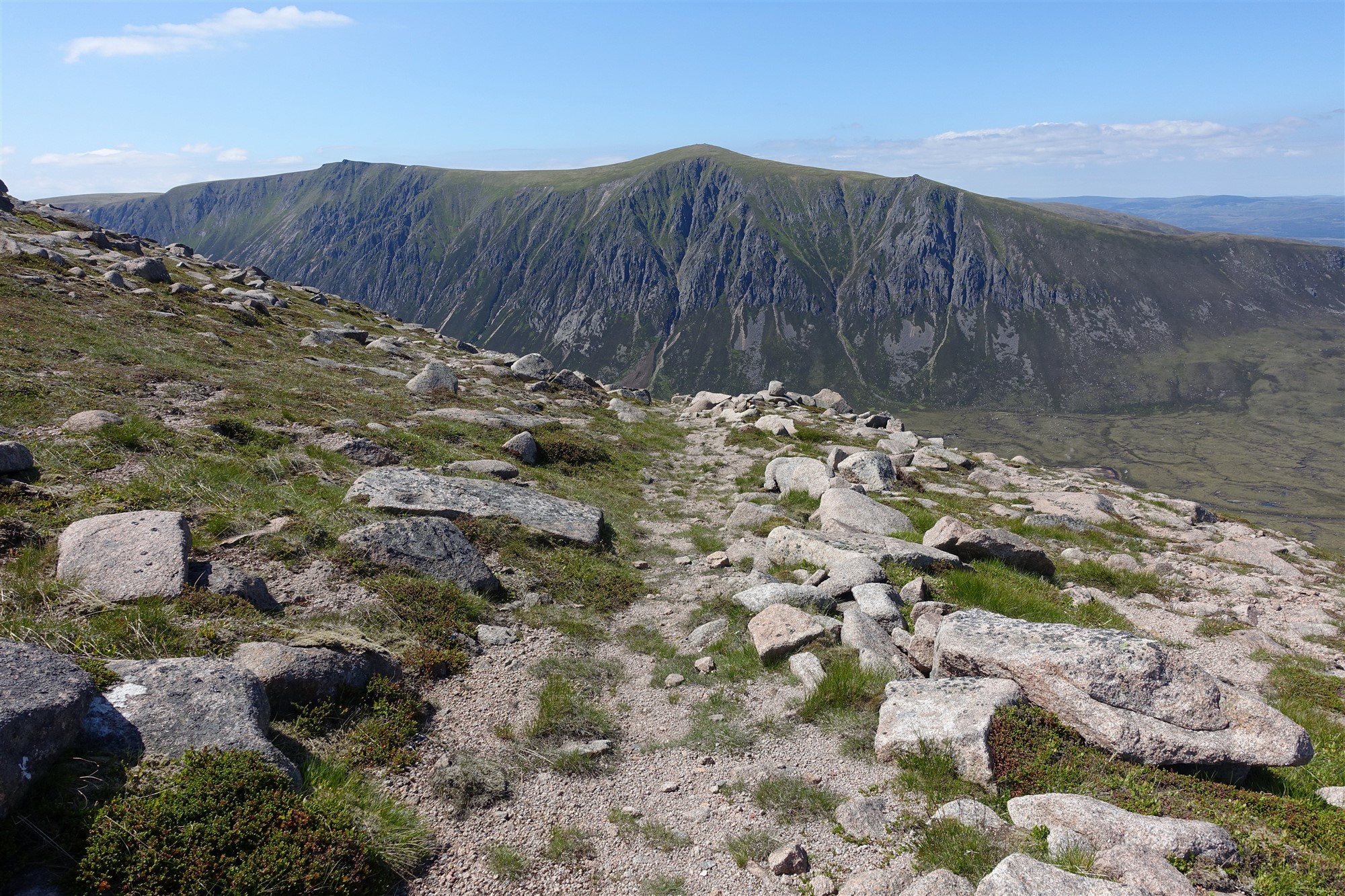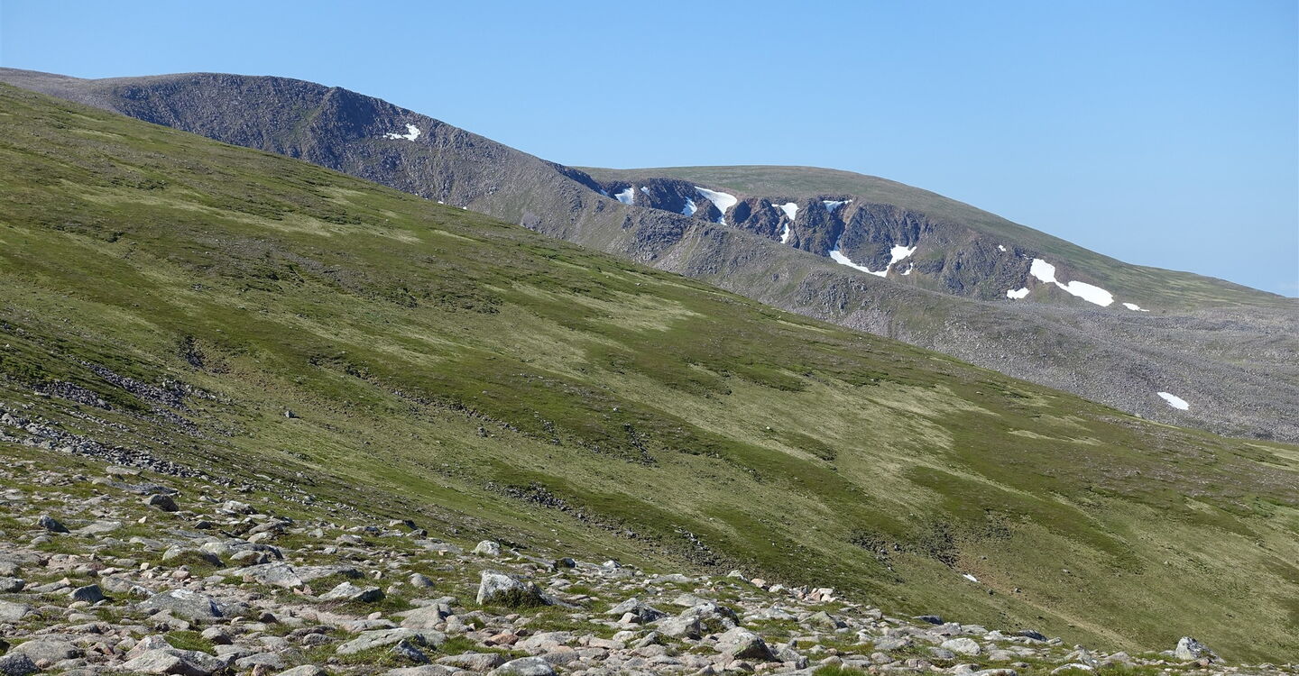 Nach 8,5 km allmählicher Annäherung beginnt nun endlich der richtige Aufstieg, der zunächst recht steil ist. Dabei ergeben sich wunderschöne Fernblicke in die Bergwelt der Cairngorms. Ein Pfad ist immer gut auszumachen und nach einem kurzen Abstieg erreicht man das flache Gipfelplateau des 03 Sron Na Lairige (1184 m). Es folgt ein kurzer Abstieg zu einer Einsattelung, um dann auf dem zunächst breiten Grat des Braeriach aufzusteigen.