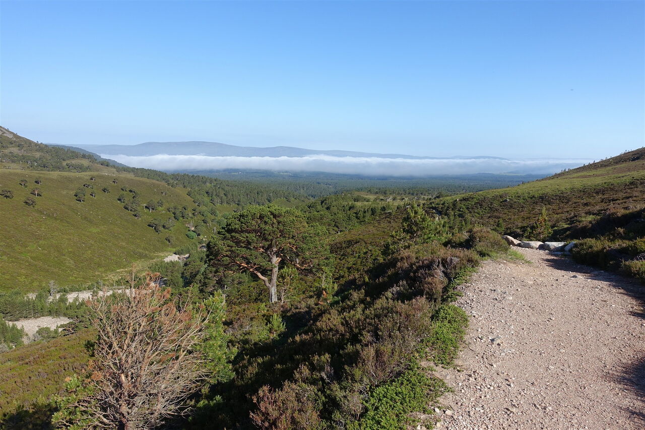 Nach 6 km mündet von links ein Pfad in unseren Weg, wir gehen jetzt auf einem schmalen Pfad oberhalb einer Schlucht. Bei guter Sicht kann man bereits halb rechts auf dem Bergrücken den weiterführenden Aufstieg nachverfolgen. Auf Höhe des Bachbettes queren wir selbiges, um an dieser geeigneten Stelle ein Zelt aufzubauen – wenn man aus der Tageswanderung eine Zweitageswanderung macht. Sonst wandern wir immer noch ein kurzes Stück auf dem Pfad weiter, bis von links ein Wanderweg herabführt – dieser beginnt beim Cairngorm-Mountain-Skigebiet. An dieser Stelle queren wir das Bachbett nach rechts und auf der 02 neu angelegten Wegführung (589 m) beginnen wir auf dem Ausläufer des Bergrückens vom Sron na Lairig aufzusteigen.