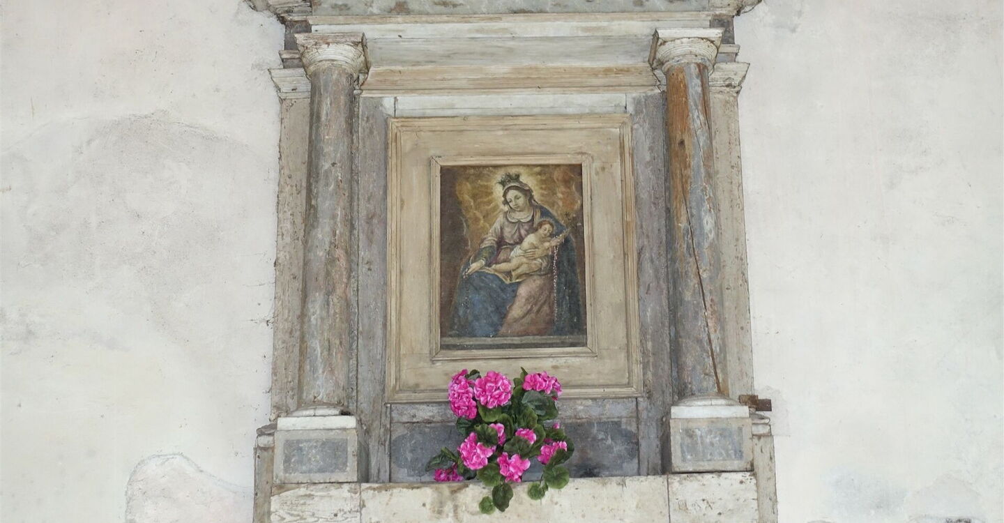 Wir kommen an den Ruinen der rechts von uns liegenden Villa Guarnieri vorbei. Bei der sofort darauffolgenden Weggabelung gehen wir halb rechts, sodass wir rechts an der Kirche vorbeiwandern, auf der ein Engel mit einer Trompete thront. Vor der Casa Rosse macht die asphaltierte Straße, auf der wir inzwischen gehen, eine scharfe Linkskehre, bis sie dann an der Hauptstraße an dem Stoppschild endet. Wir folgen dem Verlauf der Hauptstraße nach links, um diese nach ca. 500 m links in die Einbahnstraße zu verlassen. Vor einem Friseurladen endet die Straße, wir gehen rechts und bei der nächsten Möglichkeit sofort wieder rechts. Abermals gabelt sich dann die Straße, wir gehen nun halb links, wieder in eine Einbahnstraße, die 03 Via Rive Alte (266 m).