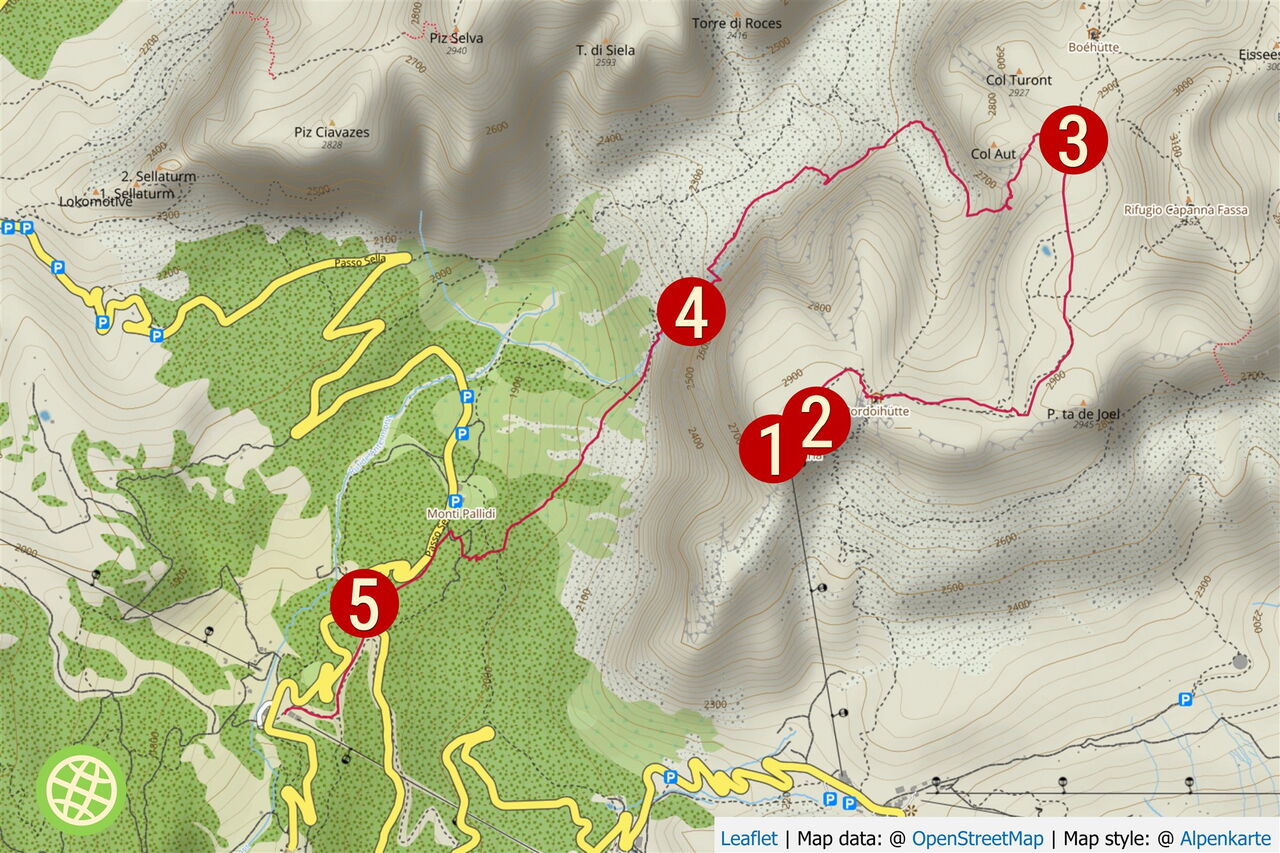 Geokoordinaten zum Start 46.473683 11.774667. Sie führen Dich nach Canazei, wo Du das Auto parkst und mit dem Lift weiterfährst.