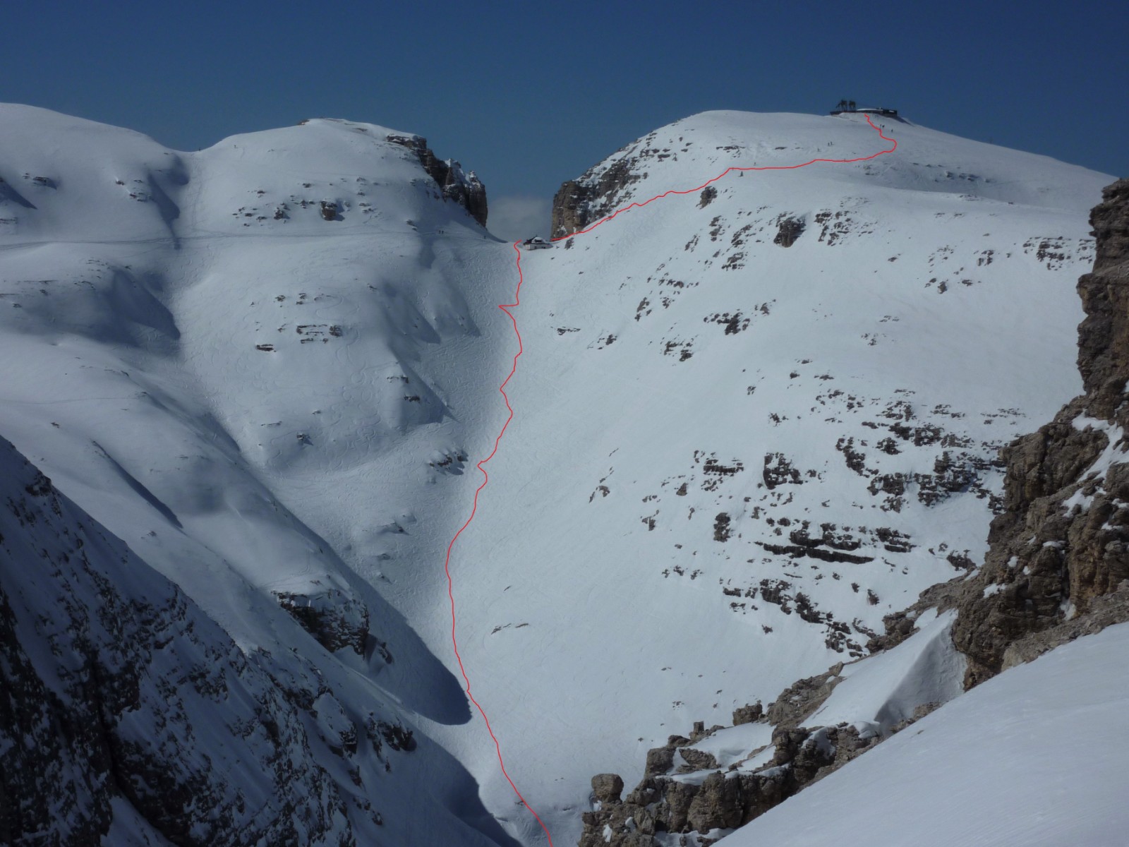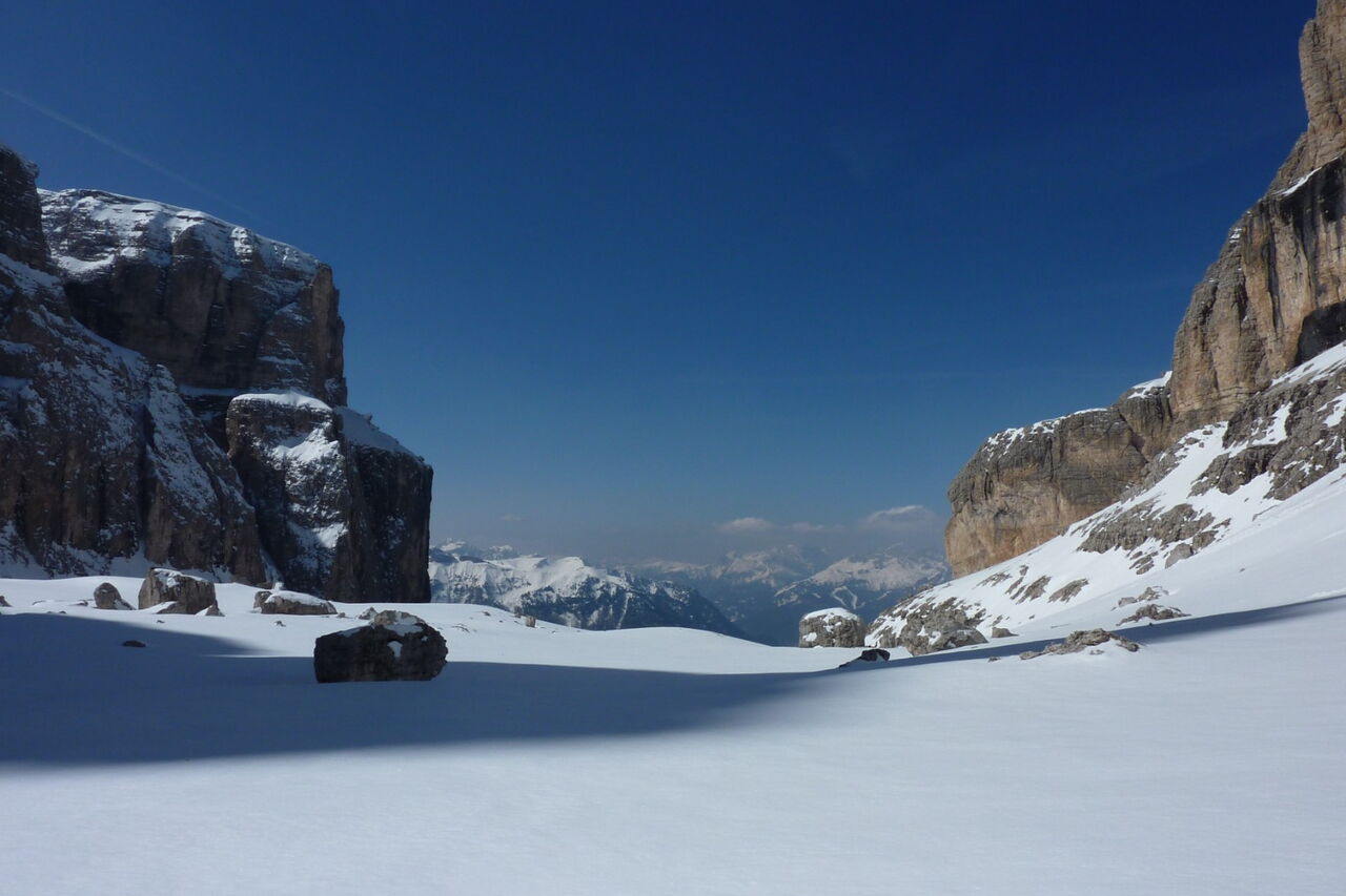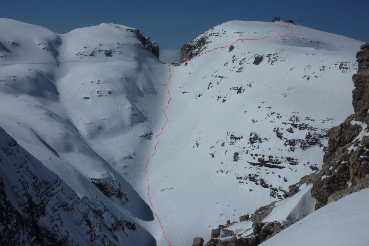 Wenn noch keiner die Strecke gefahren ist, ist die Orientierung ab den Latschenkiefern nicht so einfach. Die Abfahrt führt über einen Nordhang und Westhang. Folgende Ausrüstung wird empfohlen: Produkte für alpine Sicherheit im Schnee, Freerideski und Skitourenhelm. Es empfiehlt sich die Einkehr in das Rifugio Maria bei der Bergstation, welches nach Maria Piaz, der Pionierin des Tourismus am Pordoipass, benannt wurde. Beste Jahreszeit: Januar bis April. Uns erwarten kurze Stücke mit bis zu 35° Hangneigung.