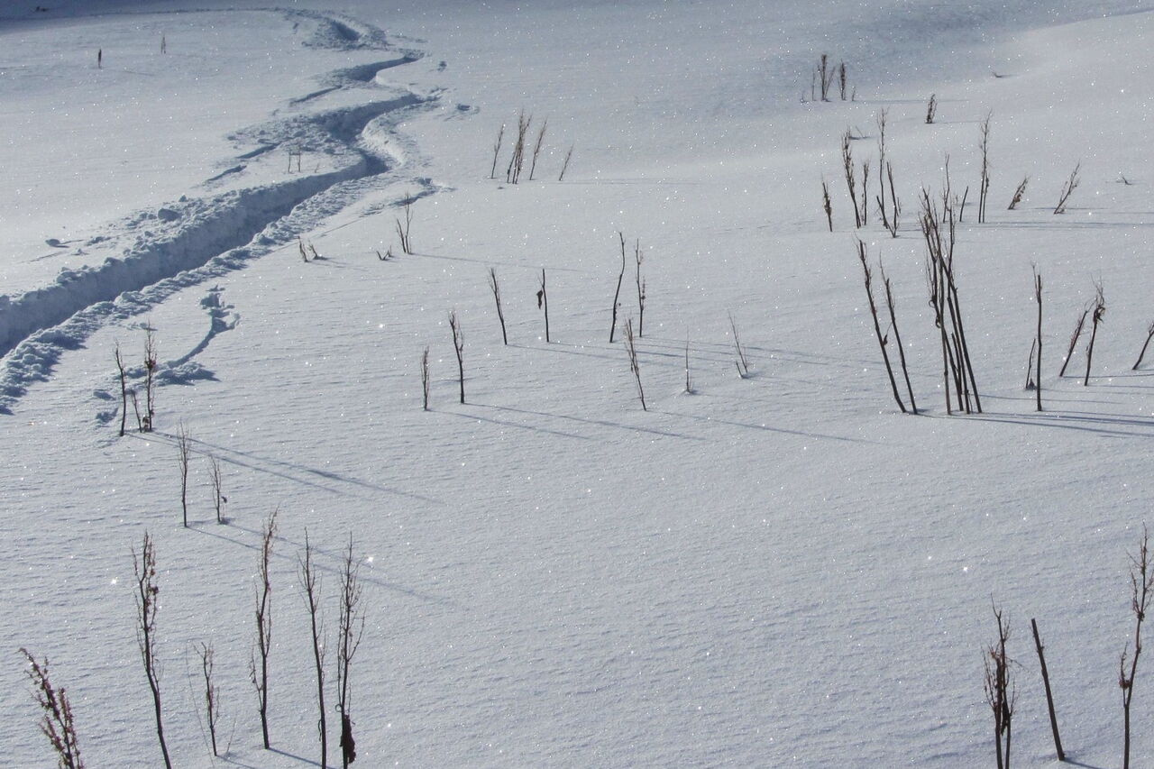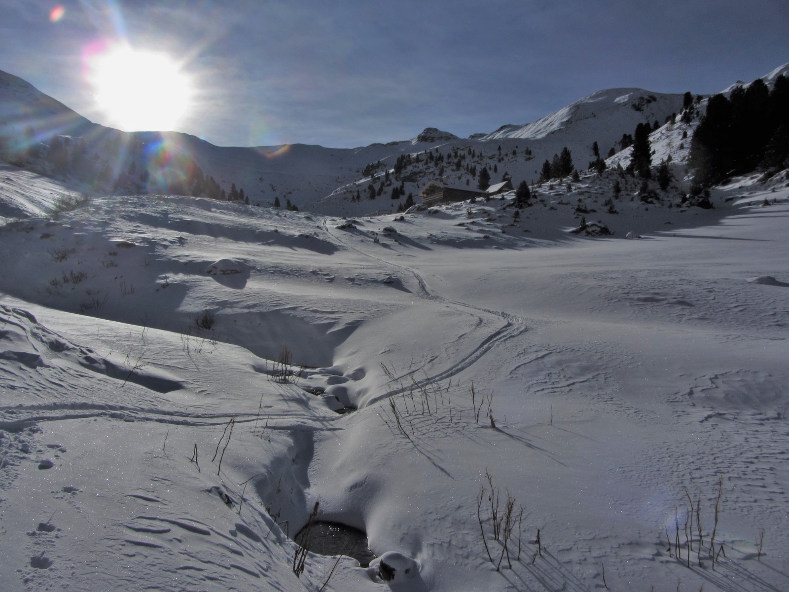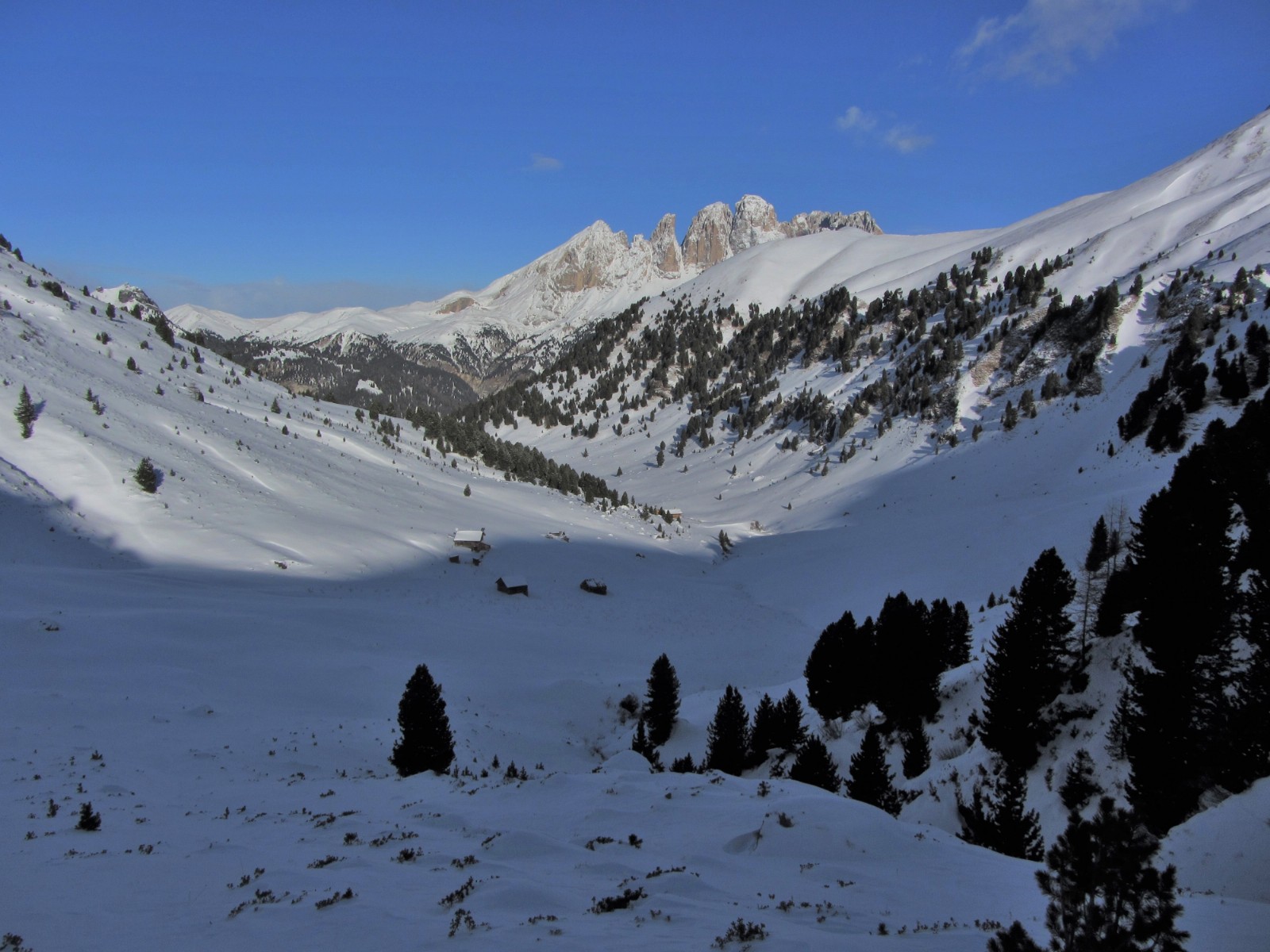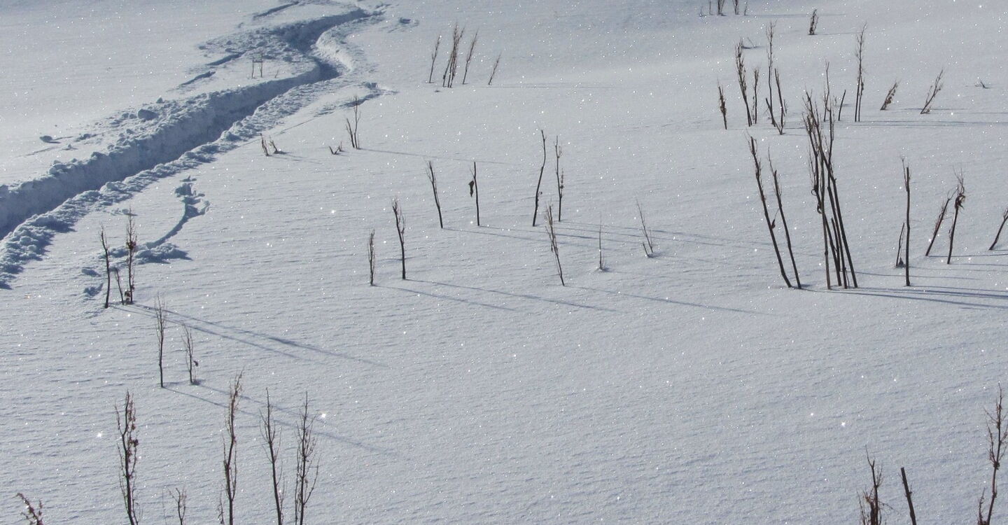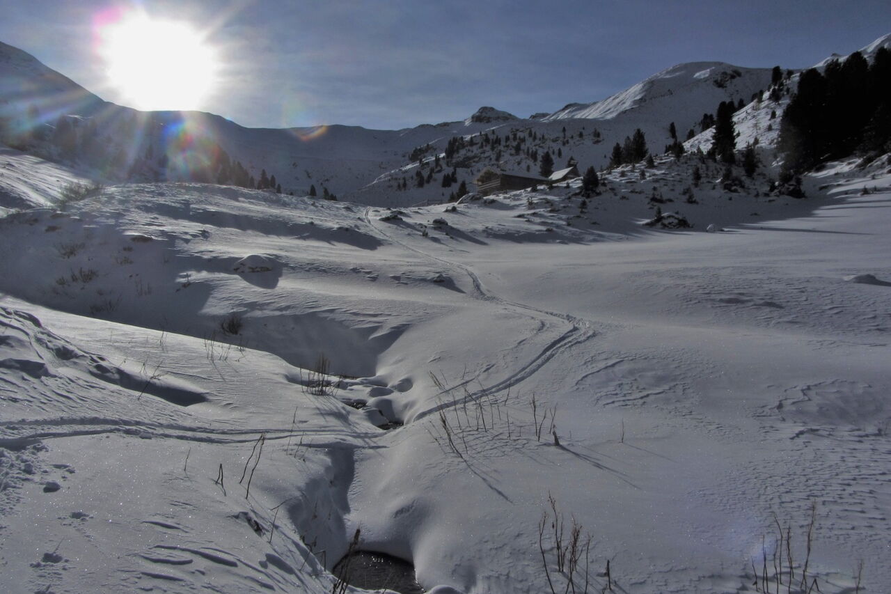 Diese Tour kann nur bei genügend Schnee bis ins Tal gemacht werden! Nach ein paar Almhütten und kurzen Schiebestücken treffen wir auf den Wanderweg nach Fontanazzo.