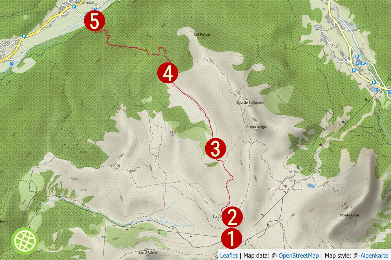 Von Canazei Penia kommend, geht die Tour bei der Bergstation des Sessellifts Nr. 132 Sella Brunech los. Wir fahren einige Meter ab, um dann in nördlicher Richtung 80 hm auf den L`Aut zu steigen.
