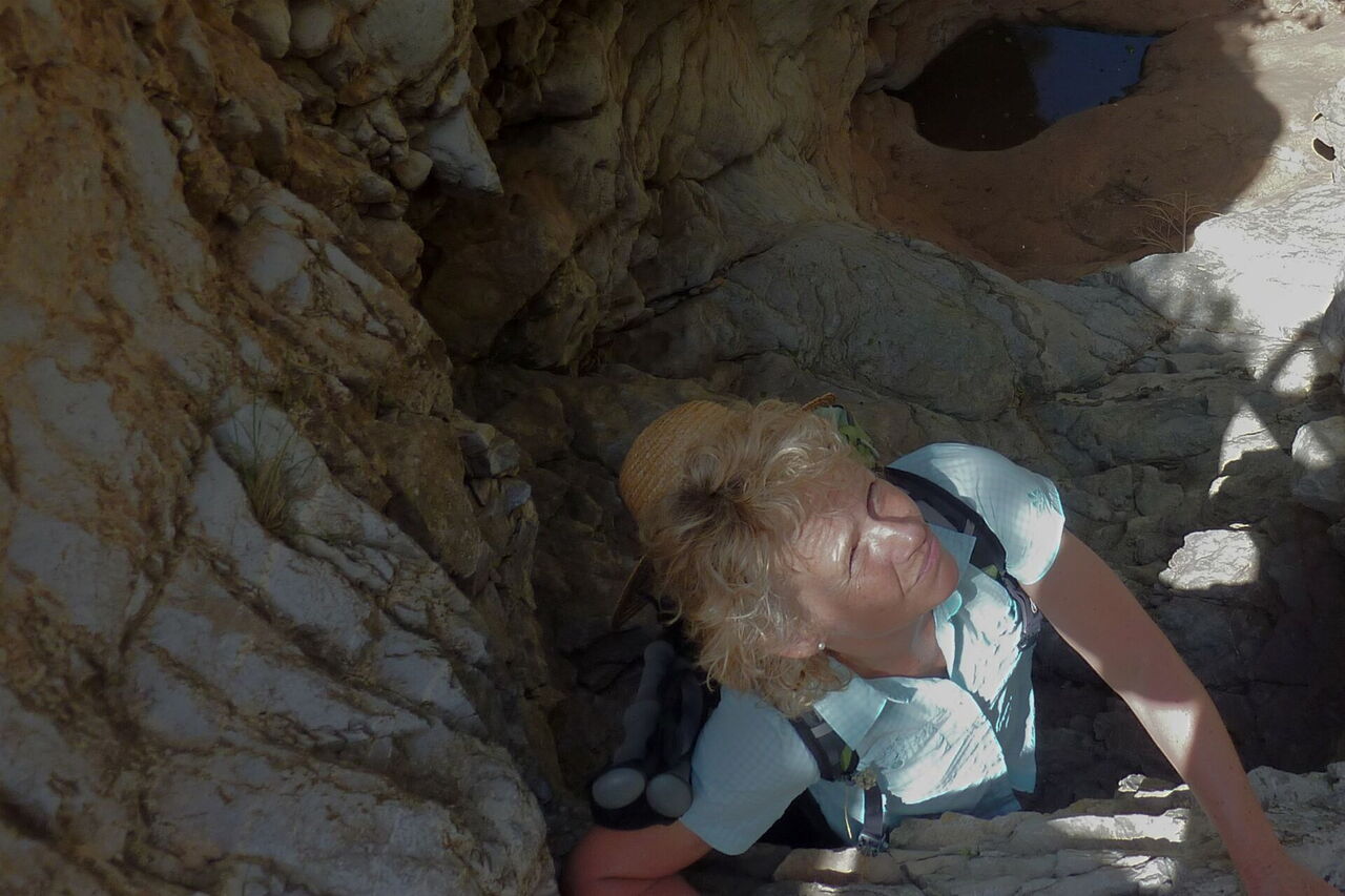 Das landschaftsprägende Attaviros-Gebirgsmassiv im mittleren Westen von Rhodos hat zwei mächtige Schluchtausläufe. Vom Hauptgipfel, dem Attaviros, endet der längste Schluchtauslauf, Richtung Osten, unterhalb des Dorfes Agios Isodoros. Richtung Westen, zwischen dem Attaviros-Hauptgipfel und dem Nebengipfel Voskotopi, schlängelt sich der Canyon Plouma Richtung Meer – unser heutiges Projekt. Aber diese Durchwanderung des Canyons, bei der man eigentlich mehr am Klettern als am Wandern ist, erfordert unsere vollste Aufmerksamkeit und ist sehr schweißtreibend. Auf der Wanderung erzählt die Natur die schönsten Geschichten: eine eindrucksvolle Schlucht mit bis zu 200 m senkrecht aufsteigenden Felswänden, den stufenförmig geschichteten Gesteinsschichten und einem nur 3 m engen Nadelöhr.
