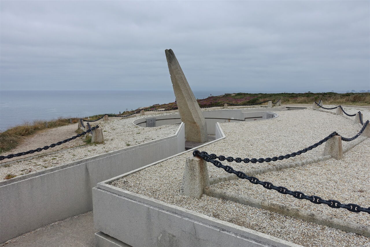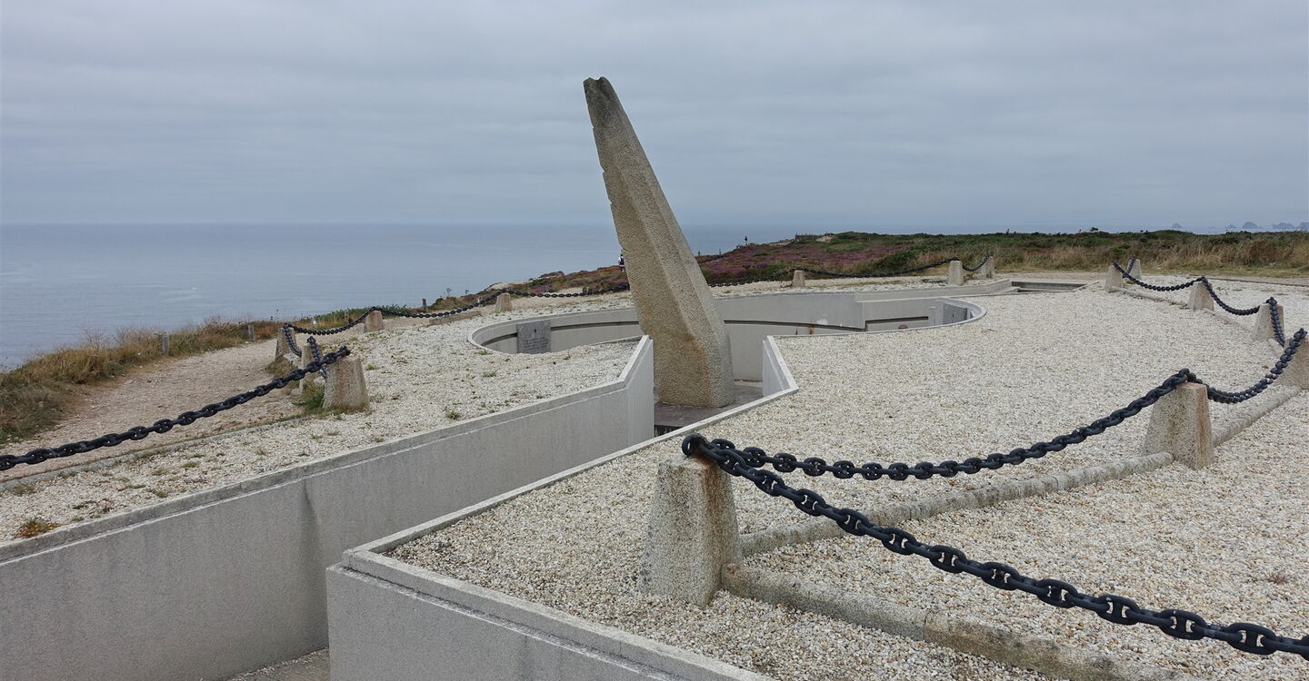 Der weiterführende Pfad schlängelt sich jetzt bis auf ca. 100 m über Meereshöhe hoch und wir erreichen das 04 Mémorial de l'aéronautique navale (95 m) du Cap de la Chèvre. Das Monument mit einer Tragfläche aus Granit gedenkt der vermissten Flieger im Nordatlantik, die seit Gründung der Marineflieger im Jahre 1910 nicht zurückgekehrt sind. Kurios: Zwei Soldaten, die 1870 und 1902 jeweils während einer Ballonfahrt zu Tode kamen, werden auch erwähnt. Ein Wirrwarr an Wegen gestaltet die Wegfindung anschließend etwas schwieriger. Hält man sich aber möglichst dicht an der Küste, so kann man nicht verloren gehen. Unterhalb befinden sich unerreichbare Kieselstein- und Sandbuchten. Nach einem nur kurzen Anstieg endet der Pfad 5 m vor einer Piste, hier gehen wir links.