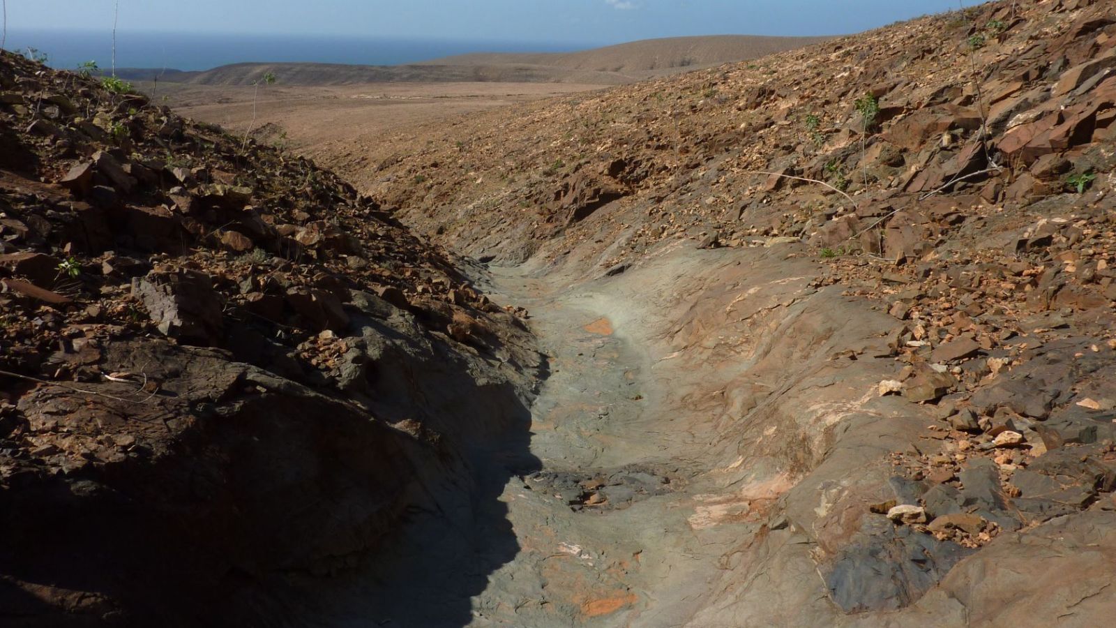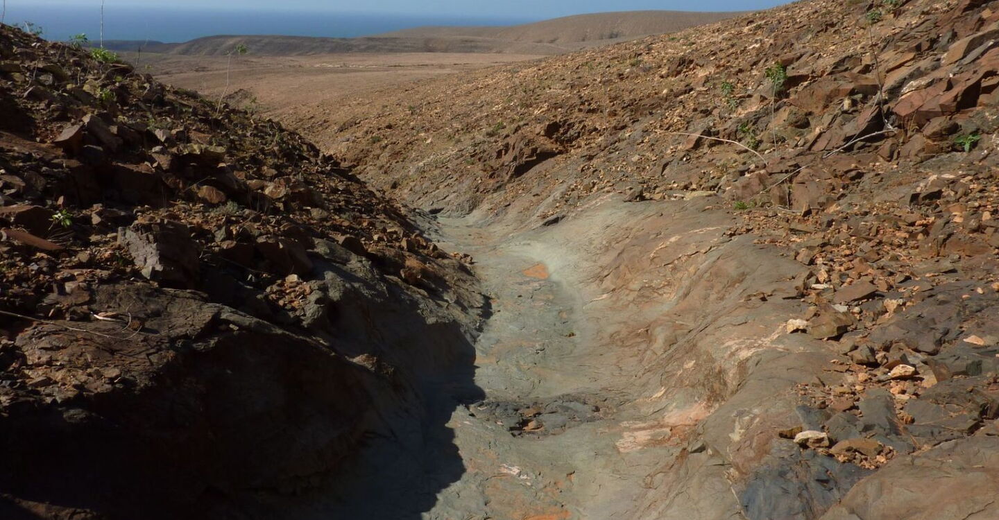 Halb rechts in westliche Richtung, parallel zu dem Ziegenzaun und der Steinmauer, steigen wir auf dem vor uns liegenden Bergrücken ab. Wir kommen an einem kleinen Wald von Wolfsmilchgewächsen vorbei, ehe sich die Grundstückbegrenzungsmauer nach rechts vom Drahtzaun entfernt. Nach einer längeren Geraden entlang des Ziegenzauns sehen wir ca. 50 m Entfernung, wie der Zaun eine Linkskehre macht. Hier halten wir Ausschau nach einem Steinmännchen, das links vom Zaun steht. An dieser Stelle kann man die Befestigungsstange des Zauns herausziehen und diesen ohne Probleme übersteigen. Wir beginnen jetzt Richtung halb rechts den rechts von uns liegenden Hügel zu queren. Dabei verlieren wir leicht an Höhe, bis wir nach ca. 180 m ein durch Erosion ausgewaschenes Flussbett erreichen. Hier befindet sich der (03) Einstieg in das Barranco (222 m). Während das erste Stück noch sehr steil ist, wird der nachfolgende Weg sichtlich flacher. Schlussendlich erreichen wir einen weiteren Ziegenzaun, den es zu überwinden gilt.