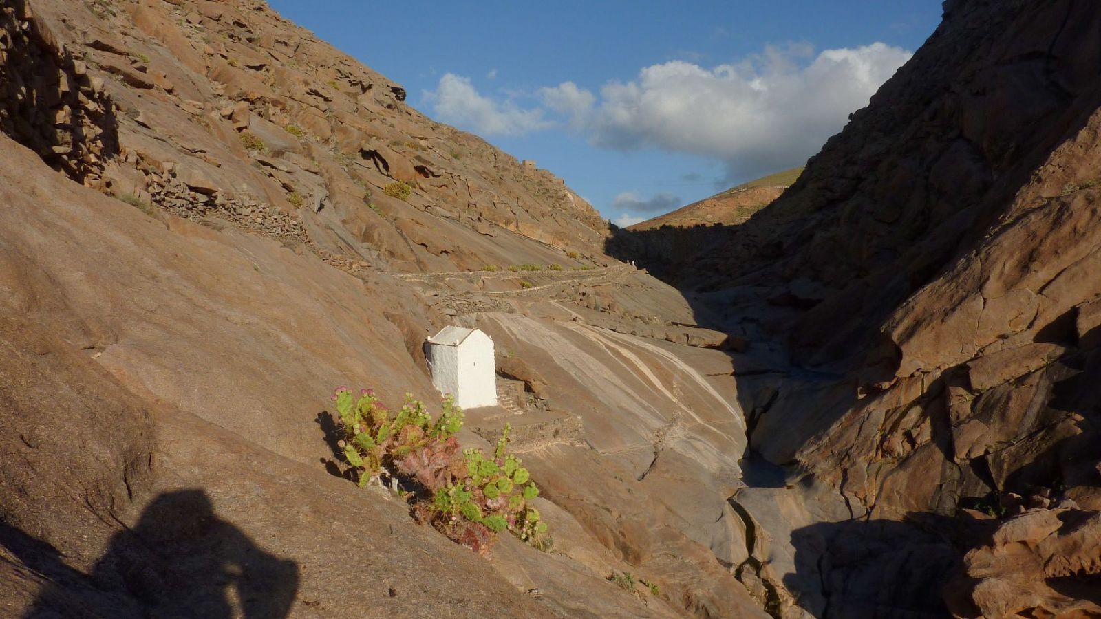 Nach einem weiteren Kilometer haben wir bereits links von uns liegende Terrassenfelder hinter uns gelassen. Das Barranco gabelt sich und ein Arm führt unter der Hauptstraße durch – wir folgen dem linken Flusslauf. Wir passieren Terrassenfelder und laufen auf dem Pfad durch das Barranco de Mal Paso direkt auf die imposant vor uns stehenden Basaltformationen zu. Bald erreichen wir eine Verzweigung, an der drei Barrancos zusammenfließen. Wir gehen dort einige Meter in das linke Barranco herein, um dann aus ihm herauszusteigen und auf dem mit Steinen gesäumten Weg in einer langen Rechtskehre die (05) Wallfahrtskirche (159 m) zu erreichen. Wir steigen noch bis zur Dammkrone auf und gehen dann links an einem der größten Tamariskenwälder Fuerteventuras vorbei, zunächst parallel zum Flusslauf, dann im Flusslauf, bis wir wieder zum Ausgangspunkt gelangen.