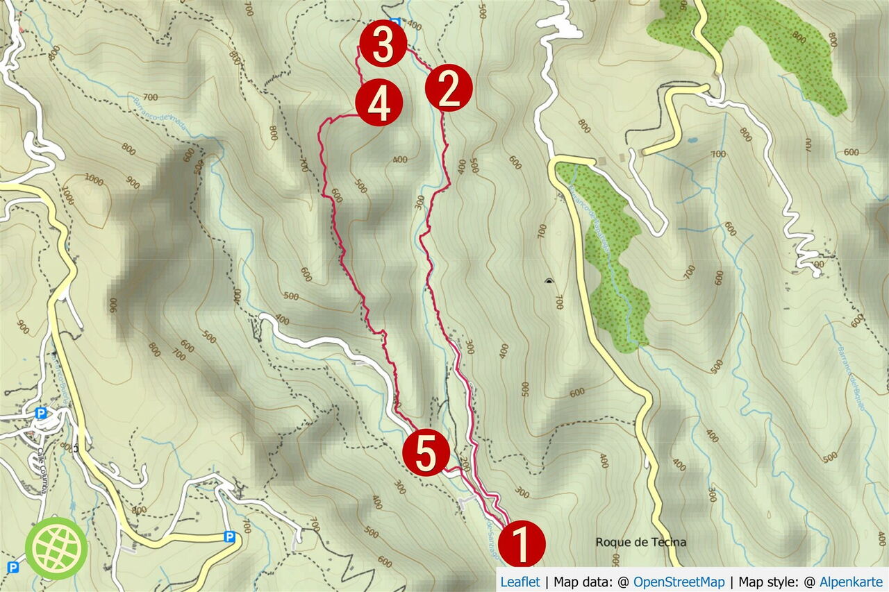 Vom (01) Start und Ziel Caserio Taco (158 m) gehen wir auf der Anfahrtsstraße taleinwärts bergauf. Bald wird das Tal zunehmend schmaler und wir passieren die Casas de Pastrana. Die Straße endet und geht bei einer Parkbucht in den Wanderweg über. Wir folgen diesem Weg durch das Barranco de Benchijigua in Richtung des Dorfes Benchijigua, steigen in das Barranco herunter und wandern ein kurzes Stück im Trockenflussbett, um oberhalb von zwei runden Wasserauffangbecken dieses wieder zu verlassen. Bei guter Sicht hat man bereits ab hier einen sagenhaften Panoramablick auf den Roque de Agando.
