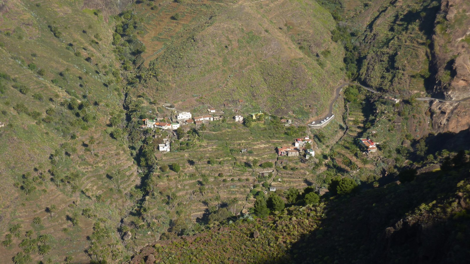An einer Mauer endet der Weg und wir gehen rechts, vorbei an dem roten Haus, durch eine enge Gasse, bis wir links entlang eines Treppengeländers in den Ortskern gelangen. Der Weiler (03) Lo del Gato (461 m) wird von wenigen Menschen bewohnt und befindet sich unterhalb vom Benchijigua. Neben zahlreichen traditionellen Häusern gibt es auch einige Neubauten. Als wichtige Lebensgrundlage wird die Ansiedlung von einer Quelle mit Wasser versorgt. Für den weiteren Weg queren wir den Ort 100 m in südliche Richtung, bis wir links unterhalb von uns ein grünes Haus sehen. Hier verlassen wir den Weg mit dem Geländer, machen eine 90°-Kehre nach rechts und gehen in westliche Richtung weitere 160 m in das kleine Barranco hinein. Dabei passieren wir ein Wasserauffangbecken und laufen durch hohes Schilf, bis sich eine gute Möglichkeit ergibt, das Barranco nach links zu queren.