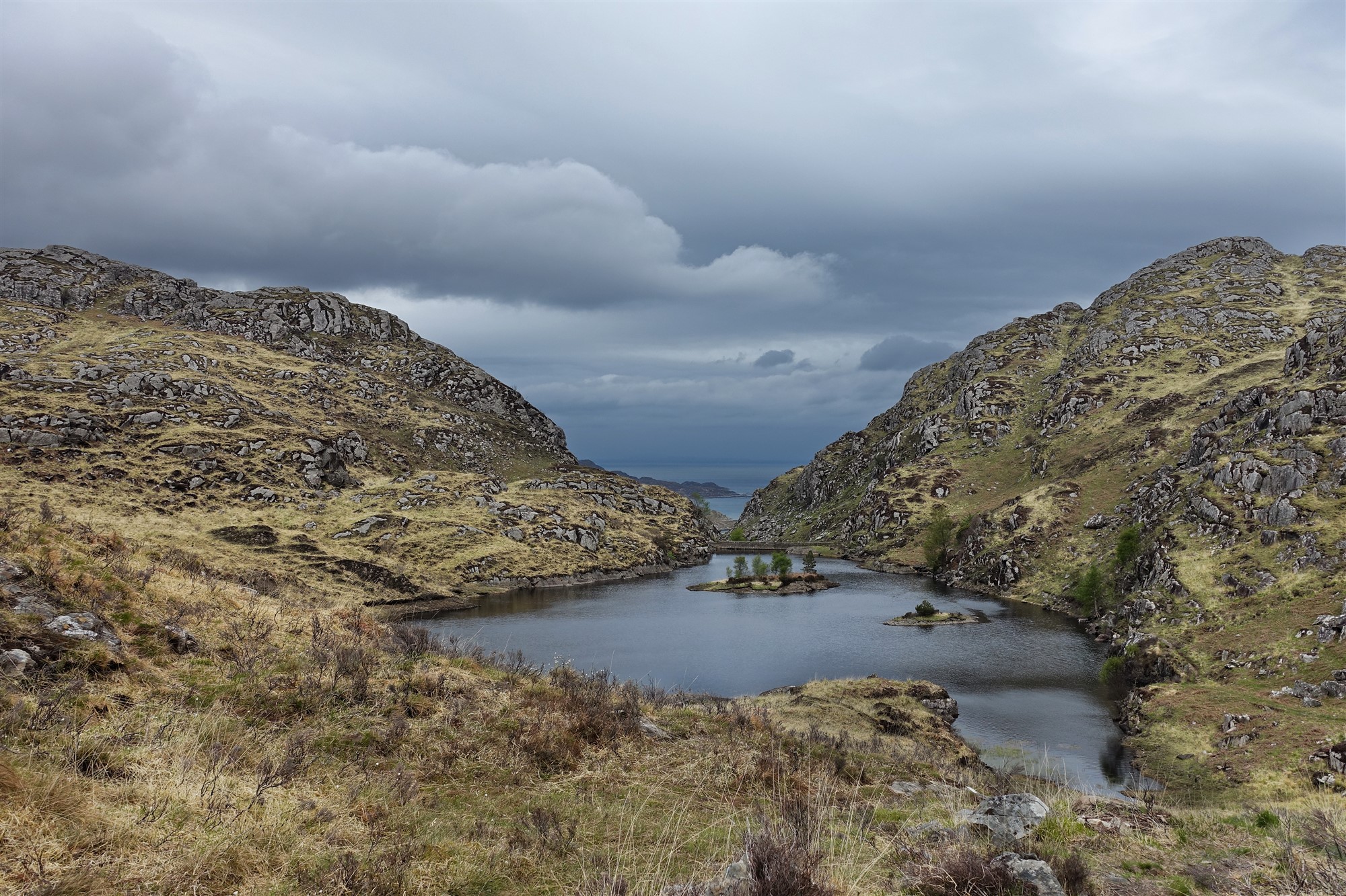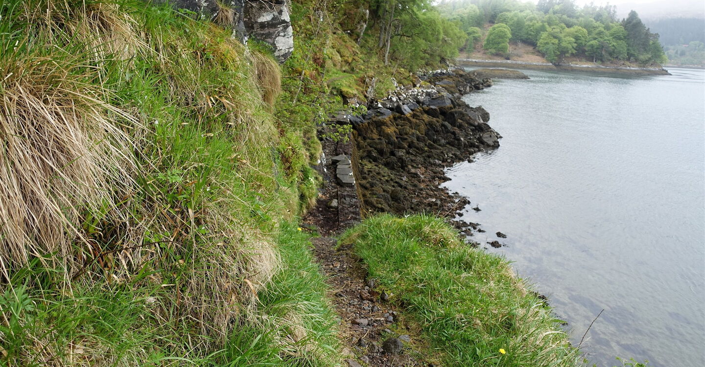 Während des Abstiegs gehen wir bei der Weggabelung halb rechts, links unterhalb sehen wir Ruinen. Der Pfad endet oberhalb des Loch Moidart, wir gehen links auf dem sogenannten 04 Silver Walk (16 m) weiter. Der Silberweg erhielt seinen Namen von einem Schatz aus elisabethanischen Münzen, die während des Baus dieses wunderschönen Küstenpfads gefunden wurden.