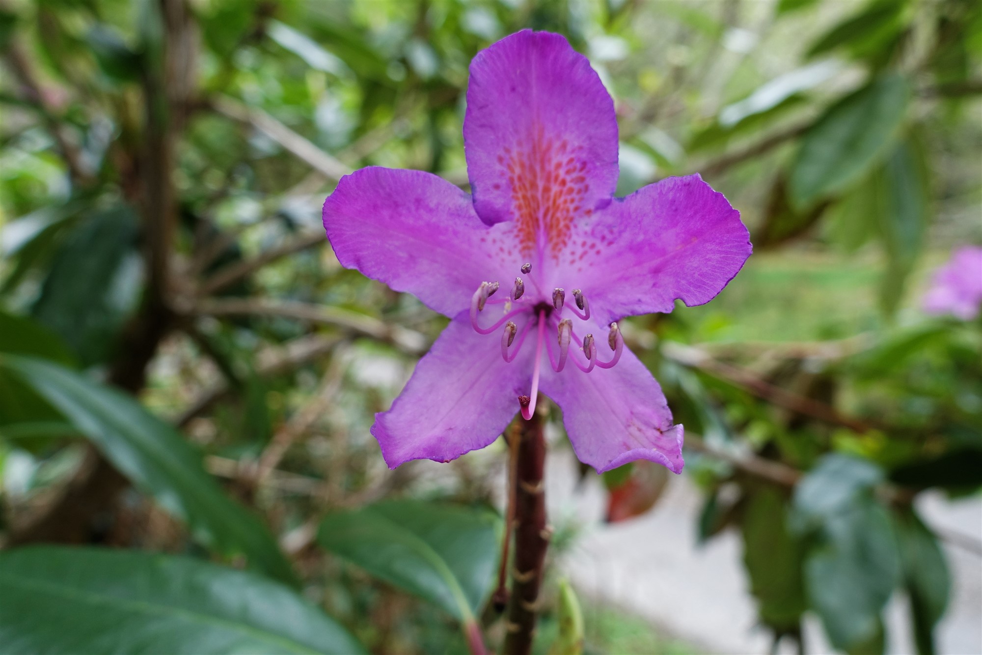 Die Piste endet an der Anfahrtsstraße, der 02 Dorlin Road (5 m). Hier gehen wir links an dem kleinen Sägewerk vorbei und noch vor dem Grundstück mit dem hellblauen Haus an dessen Zaun entlang und im weiteren Verlauf auf dem Pfad parallel zu einer Wasserleitung bergauf.