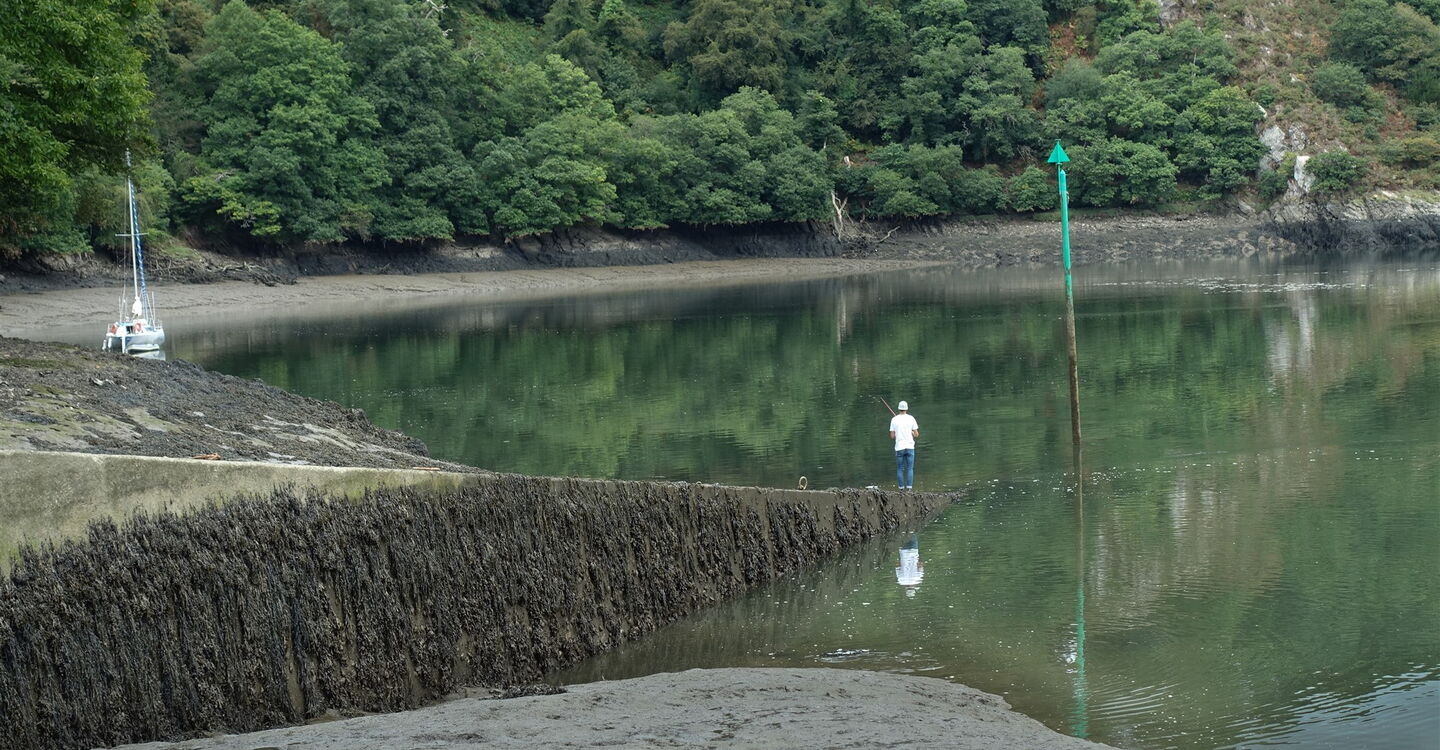 Aufgrund der windgeschützten Lage in diesem Flusstal konnte der ursprüngliche Wald mit seinen Baumriesen bestehen. Einmal mündet der Weg in die Straße, aber nach wenigen Metern biegen wir wieder rechts auf einen Pfad ab und erreichen den 03 Port de la Roche-Jagu (4 m). Hier an den Ufern des Flusses Trieux befindet sich ein kleiner Anleger für Ausflugsboote. Direkt oberhalb des Anlegers verlässt ein schmaler Pfad die Bucht und man gelangt auf einen breiteren Weg, dem wir nun oberhalb des Flusslaufes folgen.