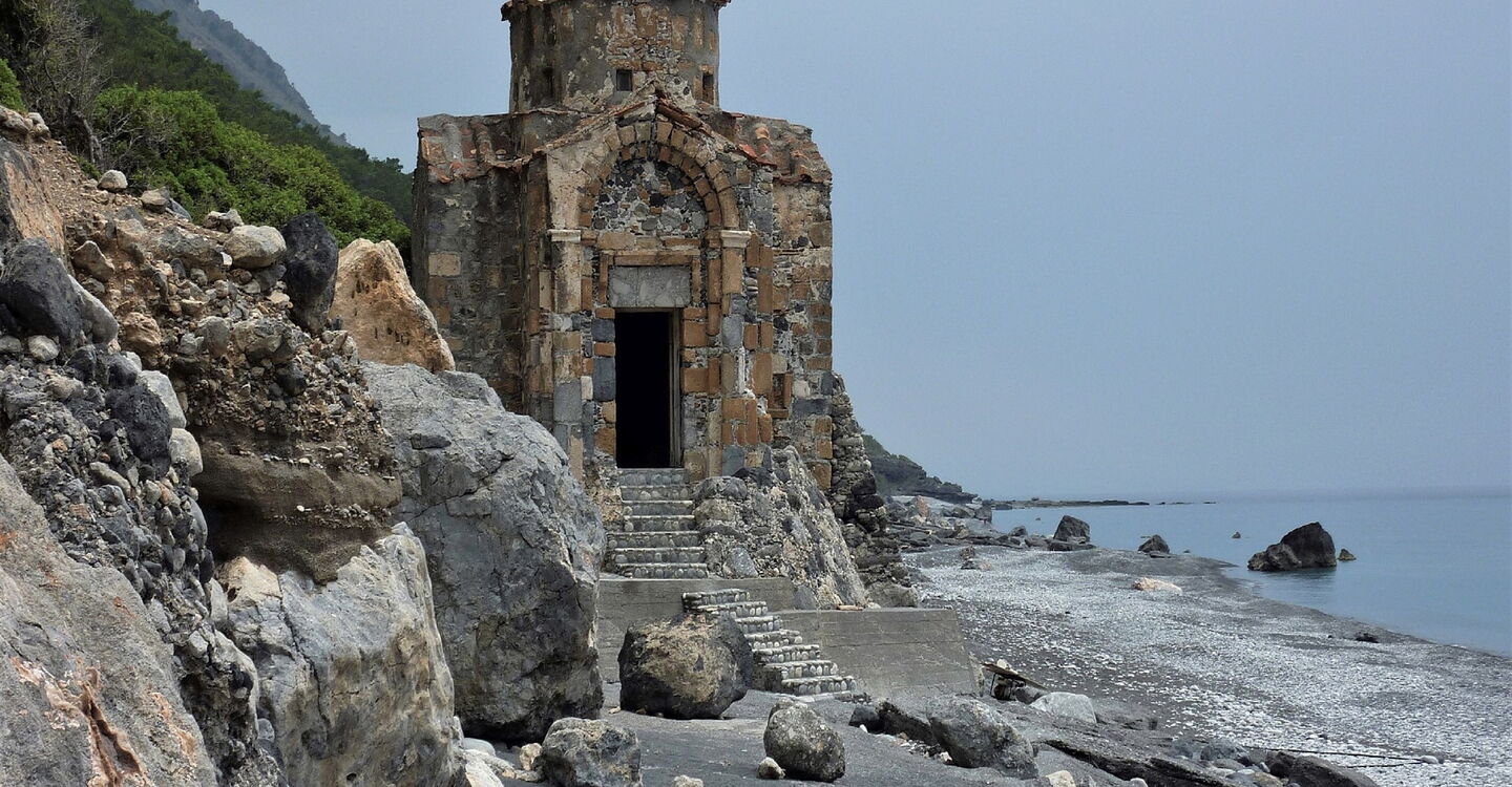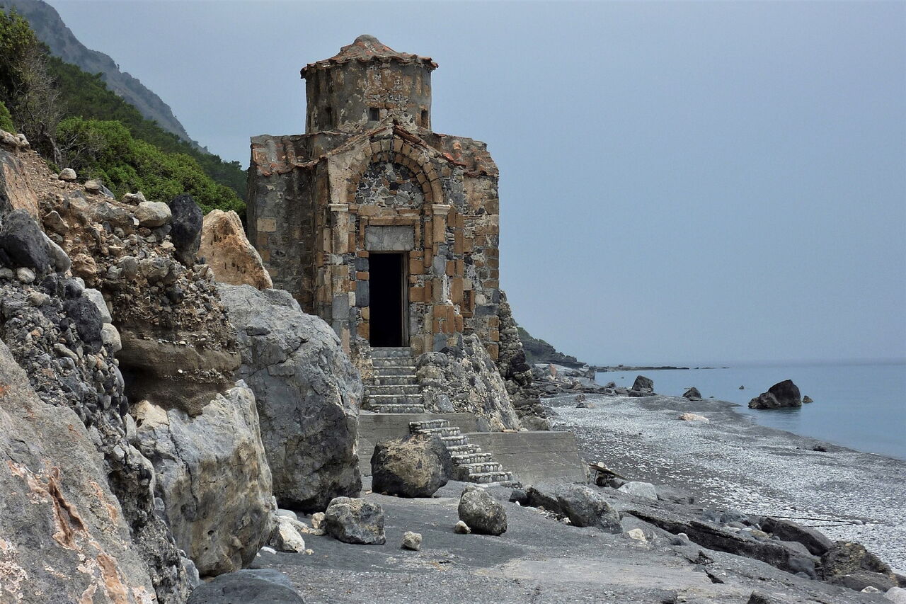 Wir wandern 5 km auf einem perfekt angelegten Küstenpfad, bis sich das Landschaftsbild drastisch ändert. Wir erreichen einen der schönsten Landschaftsstriche von Südkreta. Der Pfad führt durch einen Kiefernwald, am Strand befinden sich bis zu 30 m hohe Sanddünen und vereinzelte grausandige Strandabschnitte – fernab vom Tourismus. Man blickt ehrfurchtsvoll auf die mächtigen Berge Gingilos (2080 m) und Volakias (2116 m). An der Mündung der Elygiaschlucht befindet sich der nächste Höhepunkt, die kleine Kapelle 04 Agios Pavlos (14 m) aus dem 11. Jahrhundert. Sie ist errichtet zu Ehren des Apostels Paulus, der auf dem Weg nach Rom genau an dieser Stelle Schiffbruch erlitten haben soll.