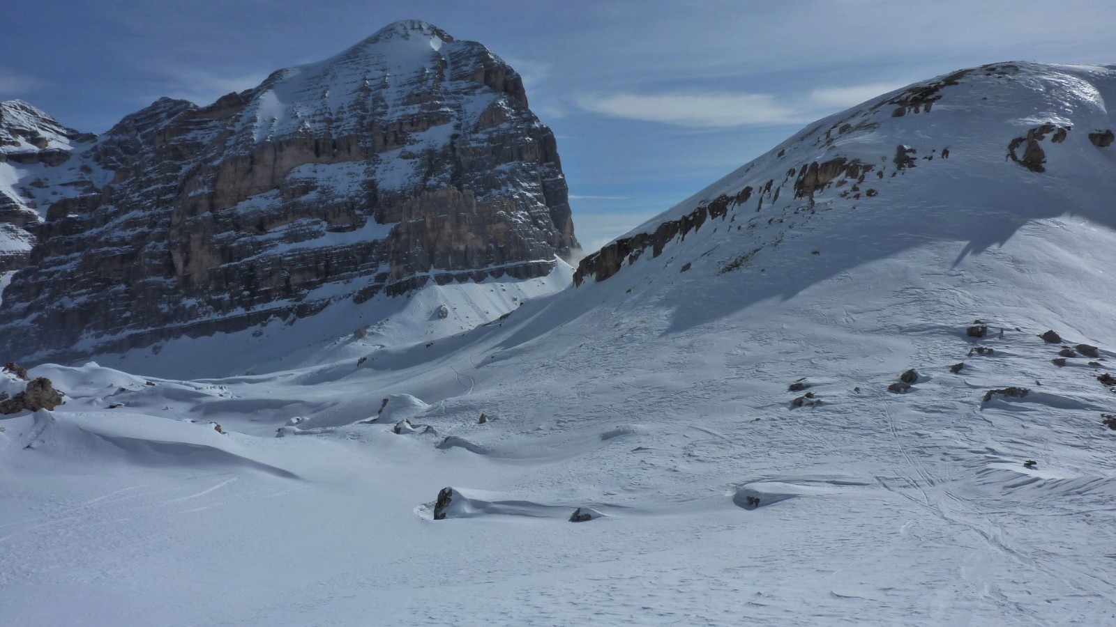 Vor uns liegt eine hervorragende Variantenabfahrt zwischen den Spitzen der Lagzuoi Torries, die bei Firnschnee, wie an unserem Tag, ein großartiges Erlebnis ist. Am unteren Ende treffen wir auf eine Forststraße.