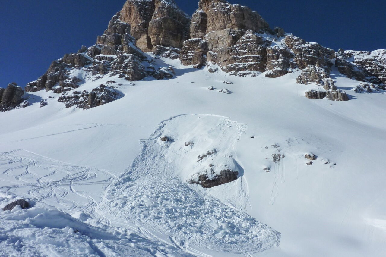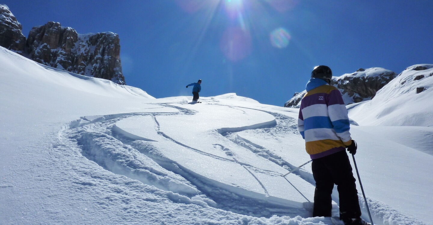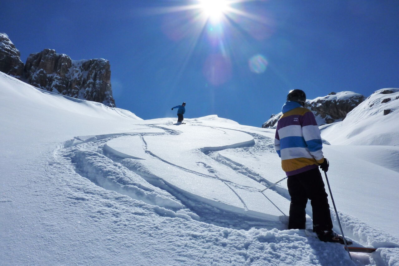 Bei der Bergstation des Sessellifts Nr. 5 Alpe Potor Nuvolau fahren wir direkt unter dem Lift zurück im Hang querend. Hier ist Vorsicht geboten, da sich immer wieder Schneebretter lösen können.