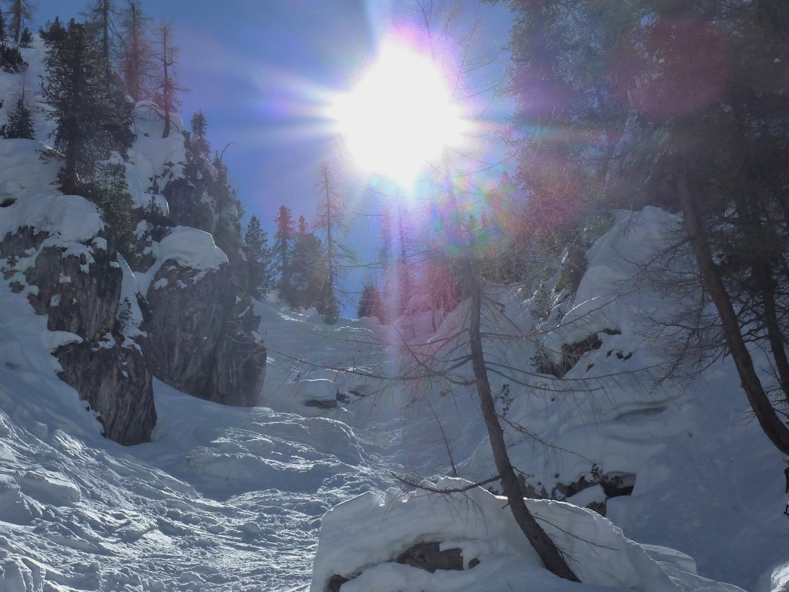 Um die Mittagszeit steht die Sonne direkt über dem schmalen Taleinschnitt. Und wir hatten als Erster eine sensationelle Tiefschneeabfahrt!