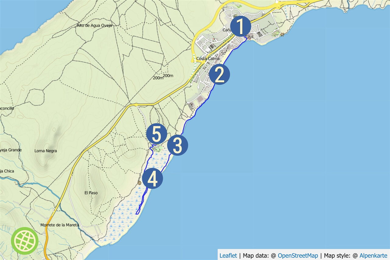 Vom (01) Start und Ziel (11 m) am Marktplatz an der Costa Calma queren wir beim Fußgängerübergang die Durchgangsstraße und halten uns leicht links. Wir gehen an der Bushaltestelle und am Hotel Fuerteventura Playa vorbei, um in die Avenida de Jahn Reisen zu gelangen. Im nachfolgenden Kreisverkehr wandern wir geradeaus. Hinter einem weiteren Kreisverkehr endet die Straße und wir erreichen die Playa de Costa Calma. Dort halten wir uns rechts und laufen weitere 275 m am Strand entlang. Vorbei geht es am Hotel Barlovento und am Sotavento Beach Club, bis einige Felsen – je nach Stand der Tide – beim Hotel SBH Taro Beach umlaufen werden müssen.