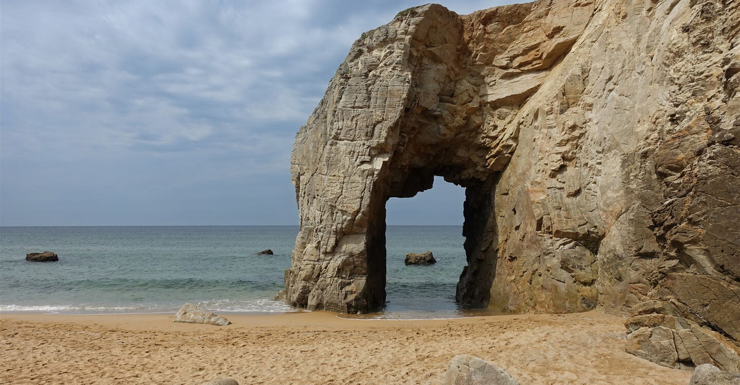 Die Halbinsel Quiberon ist nur über einen ca. 100 m breiten aufgeschütteten Dünenstreifen erreichbar und wird von zwei gegensätzlichen Landschaftsbildern geprägt. Die Ostküste, geschützt vor den kräftigen Nordwestwinden, öffnet sich zu einer großen Bucht. Die 9 km lange Westküste ist die Wetterseite mit starkem Wind und Wellen. Beschreibt das Wort Wetterseite normalerweise die schlechte Seite, trifft das hier definitiv nicht zu, denn die Westküste überzeugt durch eine faszinierende Landschaft mit Höhlen, grandiosen Farbspielen des Meeres, zerklüfteten Felsen, einem riesigen Felstor und feinen goldgelben Sandbuchten. Dort innehalten, wo die Natur verzaubert.