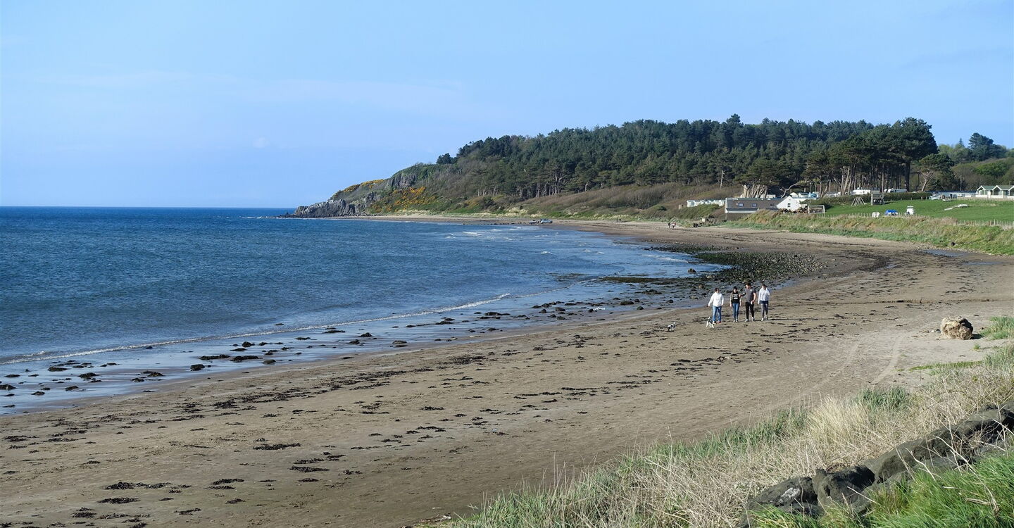 Die Erkundungsrunde beginnt beim 01 Beach car park (2 m) am nördlichen Ende des kleinen Dorfes Maidens. Von dort aus geht es herunter an den Strand und anschließend rechts in nördliche Richtung. Je nach Stand der Tide kann man direkt am Strand gehen oder auf dem Fußweg oberhalb der Küstenbefestigung. 300 m hinter einem kleinen Bachlauf, der in das Meer fließt, verlassen wir den Strandabschnitt über Holztreppen und gelangen in den Wald oberhalb der Klippen. Dort angekommen gehen wir links, bei der nächsten Weggabelung erneut links und bei der darauffolgenden Weggabelung rechts. Im Mai blüht der Ginster farbenfroh und unter den Bäumen befindet sich ein Meer aus blauen, rundblättrigen Glockenblumen.