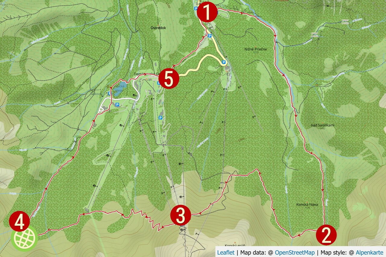 Hinter dem Parkplatz des Hotels geht es über Treppen auf einem breiten Weg oberhalb des Sees Vrbické Pleso weiter. Hinter dem Kinderspielplatz folgen wir dem Weg durch die Rechtskehre, um dann hinter der Brücke über den Abfluss des Sees links bis zur Hauptstraße mit der Informationstafel 1 vorzugehen. Wir marschieren an der Bushaltestelle, dem großen Parkplatz und dem nächsten See vorbei, bis wir zum Verkehrsschild mit dem Hinweis "P1 und P2 parken" kommen. Der nachfolgende Pfad durch den Wald des unteren 05 Demänovská-Tals (1118 m) ist zunächst nicht einfach zu finden, da es keinerlei Wegmarkierungen gibt. Entlang eines Bachlaufes geht es durch ein Waldgebiet bergab bis zur Anfahrtsstraße zum Skigebiet. Wir laufen schließlich links am Straßenrand bis zum Ausgangspunkt.