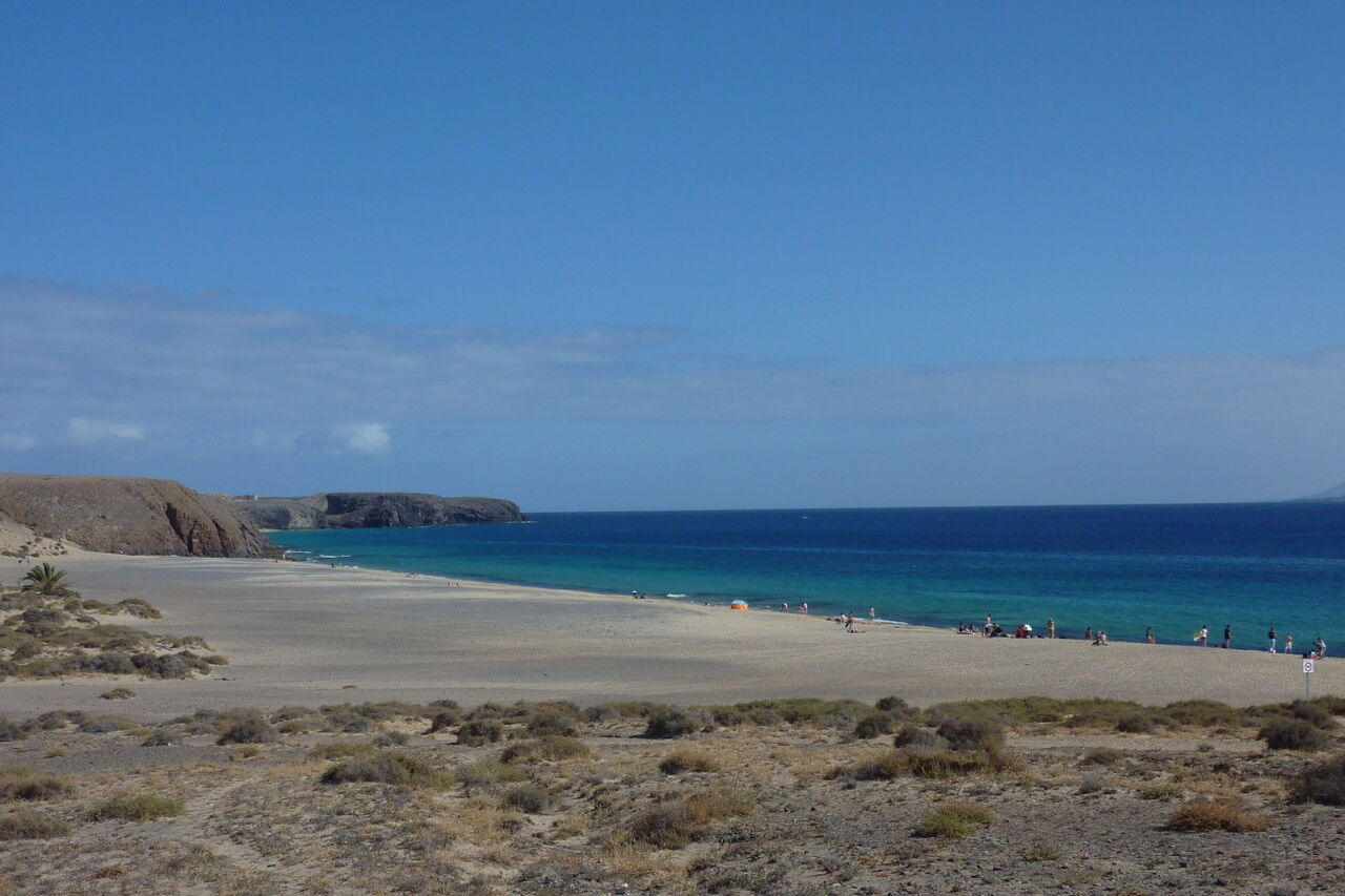 Aus der Bucht führt rechts ein Pfad heraus, wir überschreiten in östliche Richtung die Punta Papagayo und erreichen die (05) Playa del Congrio (1 m) (370 m lang und 30 m breit). Klettert man am nordöstlichen Ende des Strandabschnitts über Felsen, so erreicht man die meistens starken Winden ausgesetzte Playa de Puerto Muelas (100 m lang und 20 m breit). Wir jedoch verlassen die Playa del Congrio in nördliche Richtung, um nach einigen Metern dem in westliche Richtung leicht ansteigenden Sandpfad zu folgen. Auf einer Anhöhe können wir bereits den großen Parkplatz sehen, den wir als Nächstes überqueren. In der von uns aus gesehenen rechten äußeren Ecke beginnt der Rückweg durch 2 große Steine hindurch. Bereits nach 10 m nehmen wir die Weggabelung rechts, gehen nach 70 m links den Hügel herunter und folgen dem Pfad im weiteren Verlauf. Nach weiteren 250 m quert ein Weg und wir wandern nun rechts an einem von Steinen gesäumten archäologischen Fund vorbei. 150 m nachdem wir einen Sandwall überschritten haben, geht es abermals links bergauf. Wir queren die Bucht auf einem Pfad, der die beiden Parkplätze verbindet, bevor es wieder bergauf geht und wir den dritten rechten Abzweiger nehmen. Sobald wir auf der Anhöhe sind, treffen wir auf einen weiteren Weg, der links in Richtung der Häuser verläuft. Der Pfad führt auf die Asphaltstraße, die wir queren. Bei dem folgenden Kreisverkehr gehen wir rechts und kommen zurück zum Ausgangspunkt.