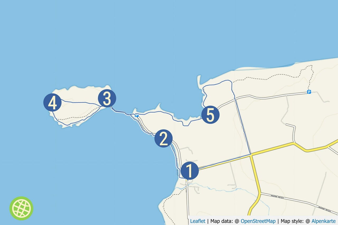 Hinter diesem befindet sich ein erstes kleines Gatter. Hinter dem zweiten Gatter gehen wir an der Weggabelung geradeaus und weiter auf dem grasigen Pfad in Richtung des 03 Lighthouse (52 m). Der 1925 erbaute Leuchtturm ist nur 11 m hoch, steht dafür aber 52 m hoch über dem Meeresspiegel. Von dort aus gehen wir in südlicher Richtung an der spektakulären Steilküste entlang. In den geschützten Felsen nisten Eissturmvögel, Trottellummen, Tordalken und Papageientaucher. Wir überqueren wieder die Meeresenge, steigen die Treppen zum Parkplatz hoch und gehen dort links weiter entlang der Küste, auch ausgeschildert Richtung Skiba Geo.