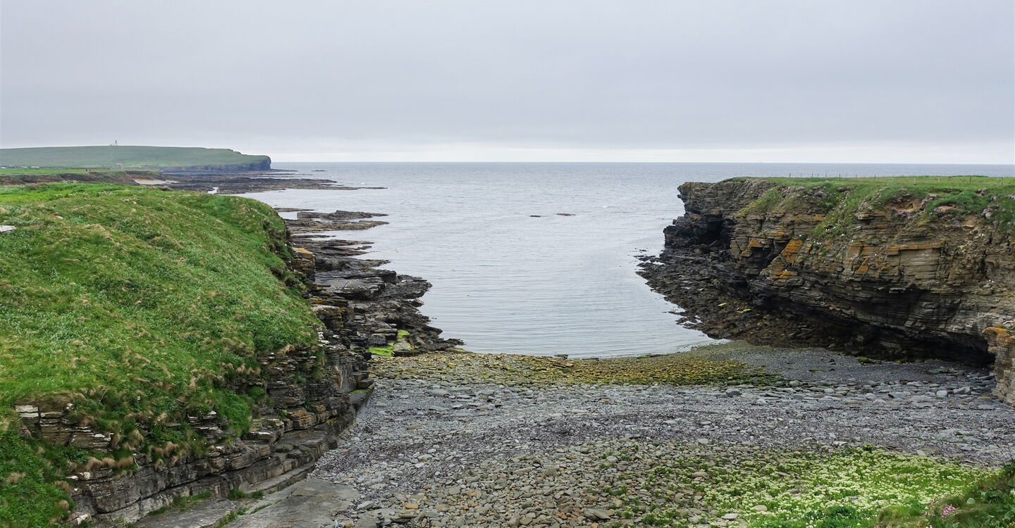 Vom Parkplatz gehen wir direkt über das Kirchengelände an der Kirche vorbei. Durch die kleine Pforte gelangen wir an die Küste, an der wir rechts oberhalb der Klippen entlang der 01 geschützten Bucht (1 m) wandern. Bei einer passenden Stelle steigen wir zum Strand herunter und gehen durch das große Halbrund der Bucht. Es geht über platt geschliffene Steine, Seetang und Sand, bis wir die Slipanlage von Birsay erreichen. Von dort ist bereits der betonierte Weg durch die Meeresenge zu erkennen.