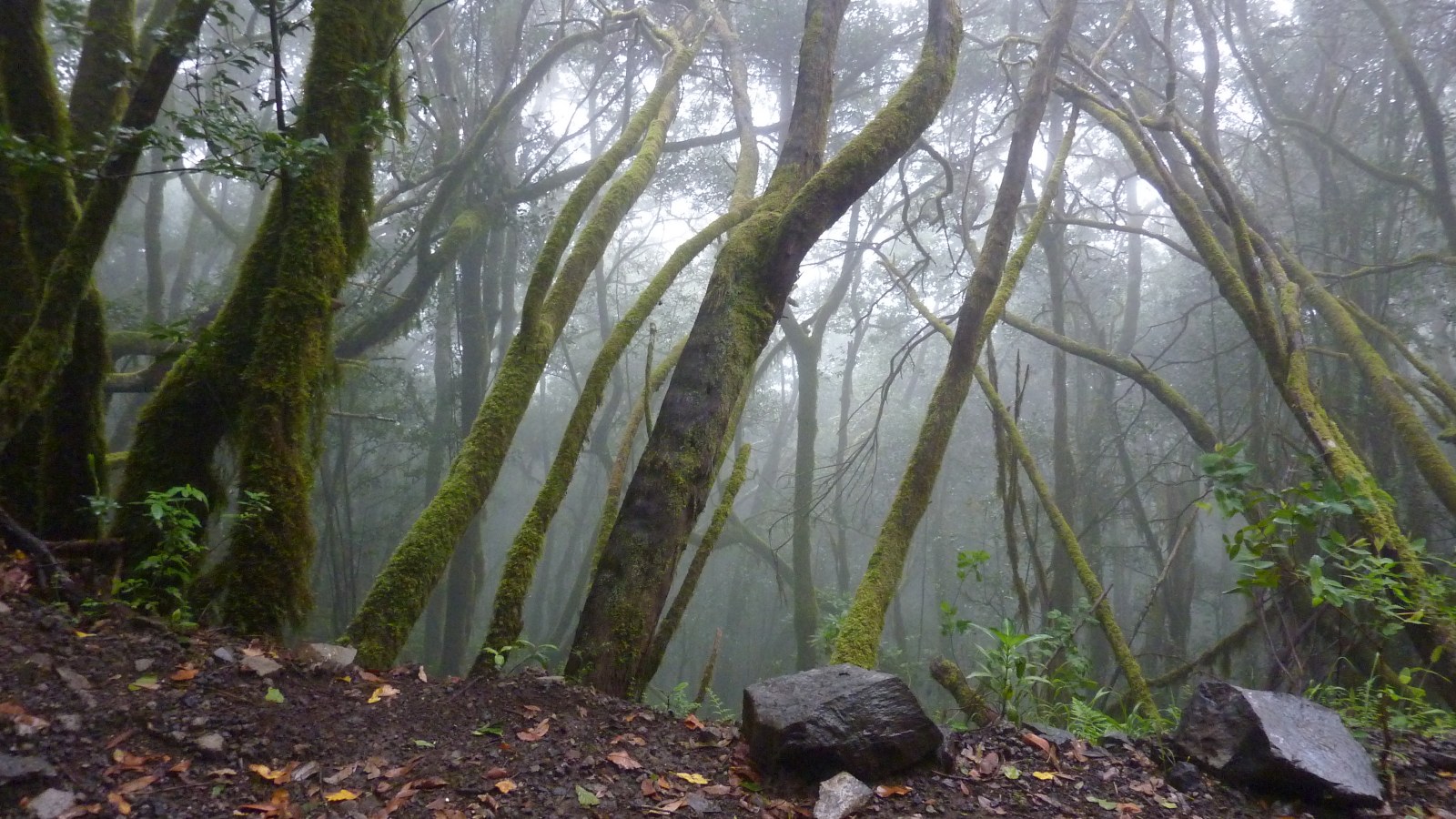 Bereits nach einigen Metern verlassen wir die Fahrstraße nach links und erreichen die (04) Ermita de Lourdes (969 m). Vom kleinen Kirchplatz führt halb links ein Weg direkt zum Weiler El Cedro - dies ist die Variante, um den Wasserstollen zu umgehen. Wir gehen jedoch auf dem etwas erhöhten Weg in nördliche Richtung weiter durch den Nebelwald, um bei der Fahrstraße rechts zu gehen und den folgenden Abzweiger nach rechts zu ignorieren. In einer scharfen Rechtskurve verlassen drei Wanderwege die Fahrstraße nach links. Wir begehen den rechten dieser Wege Richtung Hermigua und steigen zunächst durch den Wald ab.