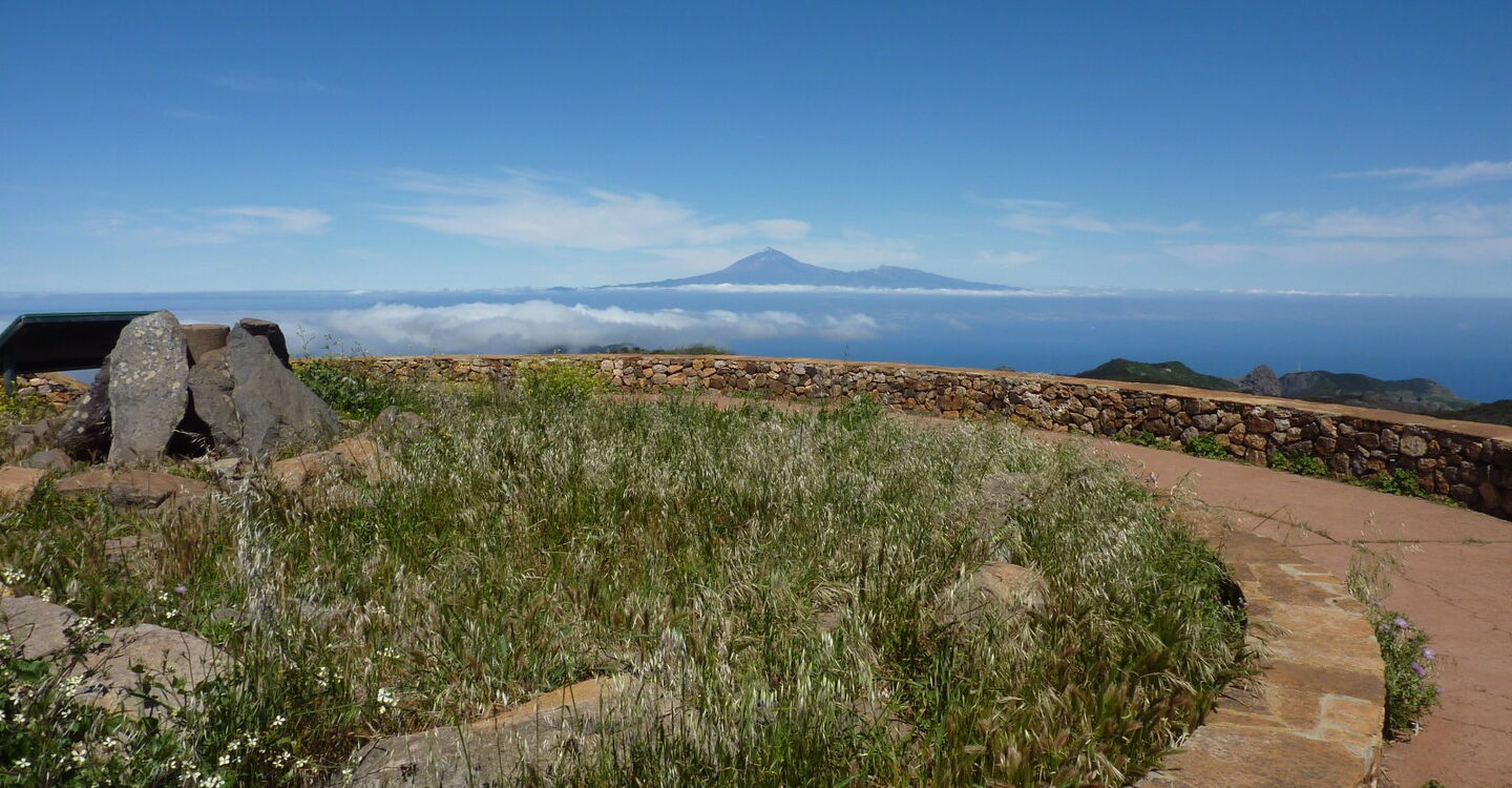 Nach 1,4 km treffen wir auf eine weitere Forststraße, folgen dieser halb links weitere 130 m, um dann bei der Weggabelung scharf rechts auf dem gepflasterten Weg bis zum (05) Alto de Garajoney (1487 m) aufzusteigen. Er ist die höchste Erhebung der Insel und überragt das umliegende Hochplateau um wenige Meter. Auch wenn das Dach von La Gomera daher kein exponierter Gipfel ist, haben wir einen imposanten Ausblick auf die gesamte Insel. Bei guter Sicht kann man sogar die Nachbarinseln Teneriffa, La Palma und El Hierro ausmachen. Oft hüllen aber fette Passat-Wolken die Bergspitze ein. Wir überschreiten den Gipfel und laufen auf einem Bergrücken in nordöstlicher Richtung, bis in einer Mulde links ein Pfad abzweigt. Nach 50 m gelangen wir auf den gepflasterten Weg, um auf diesem rechts herunter bis zum Ausgangspunkt laufen.