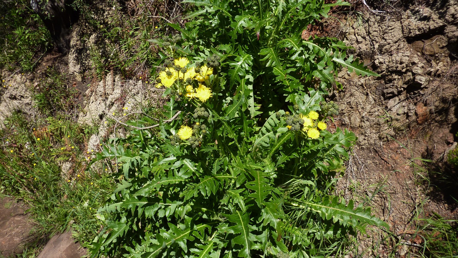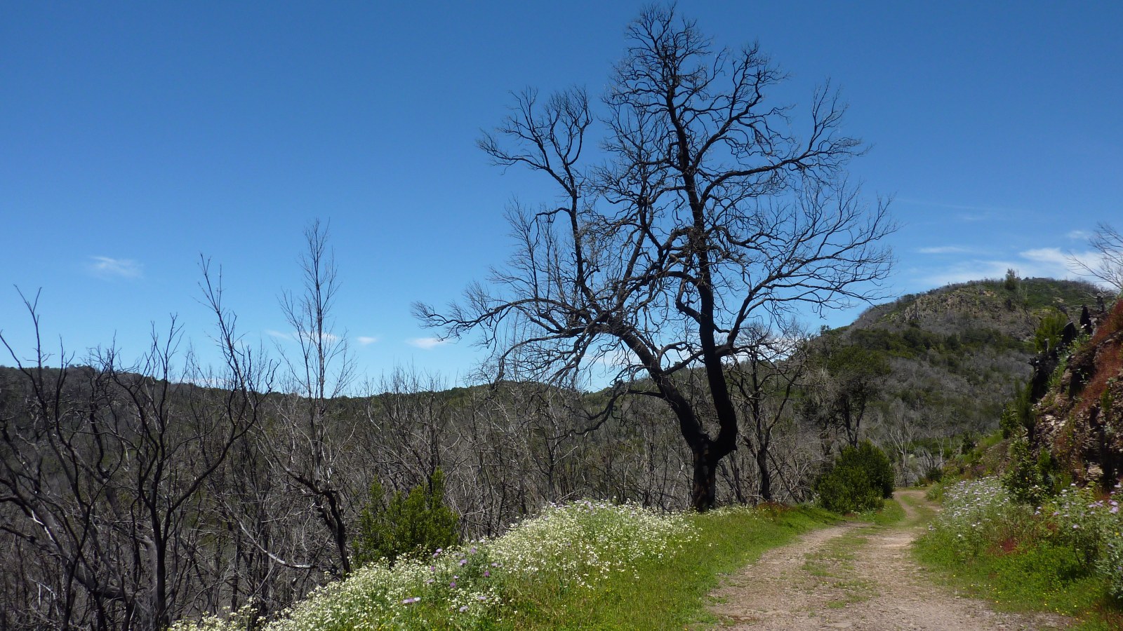 Wir erreichen die GM-2, gehen ein kurzes Stück auf dem beginnenden Forstweg nach links, um dann sofort (02) rechts (1331 m) auf dem hier beginnenden Pfad Richtung Laguna Grande weiterzugehen. Auf dem folgenden Wegstück würden wir normalerweise durch einen dichten Nebelwald gehen, aber nach den letzten Waldbränden wurde dieser leider komplett zerstört - geblieben sind nur die schwarzen verbrannten Stummel. Dieser Umstand gibt wiederum dem Bäumchen-Löwenzahn die Möglichkeit, prachtvolle gelbe Blüten in den Himmel zu strecken.