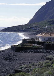 Von der Landzunge am Playa de Los Corrales im Halbrund des (01) El-Golfo-Tals (16 m) steigen wir wieder zur Verbindungsstraße von Las Puntas nach Sabinosa auf und queren diese nach halb rechts, um auf der bergauf führenden Straße entlang von gepflegten Grundstücken bis zu deren Ende aufzusteigen, das sich kurz hinter einem Wasserreservoir befindet.