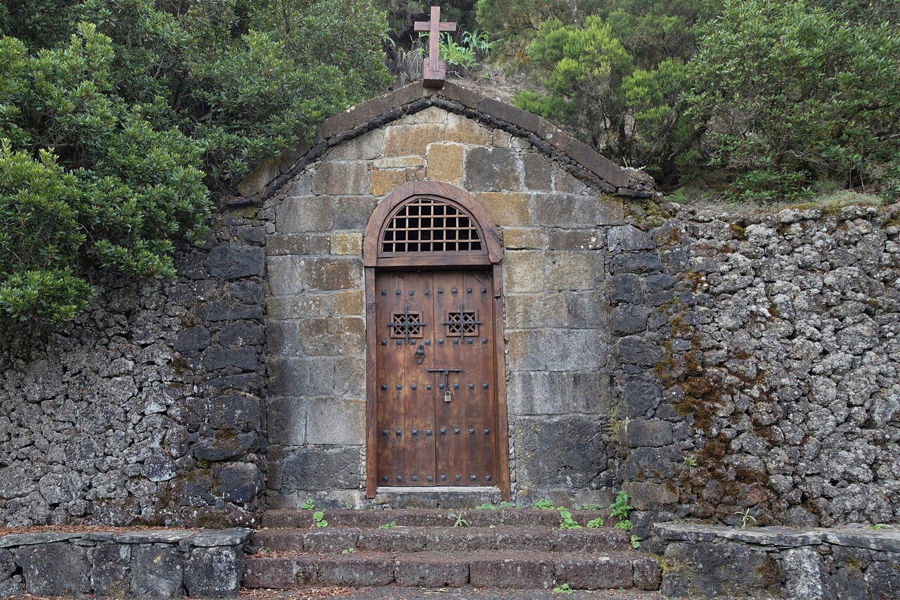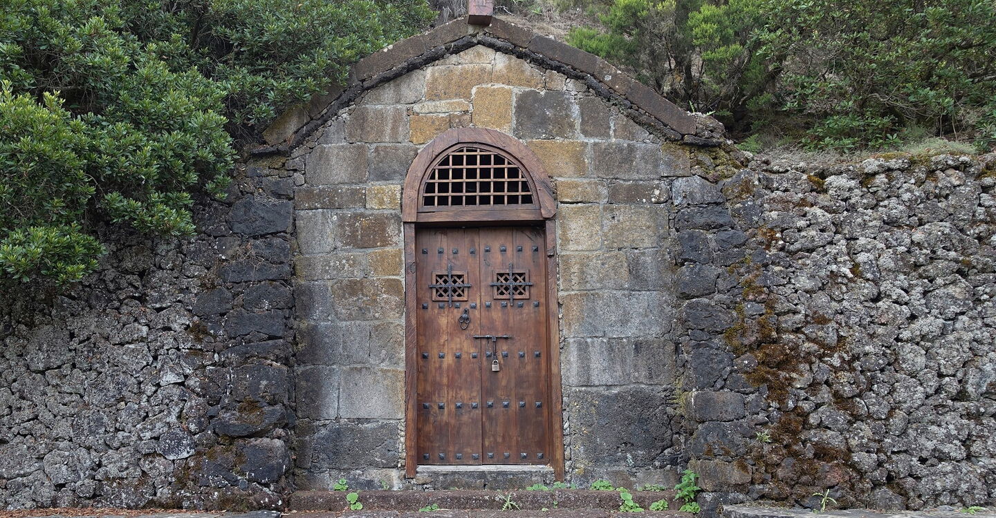 Wieder auf dem ursprünglichen Weg beginnt nach 100 m ein Camino. Kurz später queren wir die Verbindungsstraße von Frontera nach San Andres. Beim Absprungplatz für Gleitschirme gehen wir rechts auf der Straße, um dann nach 100 m scharf links zu gehen. Nach weiteren 50 m geht es rechts bergauf weiter. Bis zur (03) Ermita de San Salvador (1277 m) ist der Aufstieg eindeutig und größtenteils markiert. Über Lapilli steigen wir weiter auf, überschreiten den höchsten Punkt, überqueren die Straße nach halb links und folgen der Ausschilderung Richtung El Pinar. Der folgende Abschnitt führt noch ein kurzes Stück durch den Lorbeerwald, aber schon bald durch Pinien. Abzweiger nach rechts und links ignorieren wir zunächst und bei der folgenden Weggabelung halten wir uns halb links.