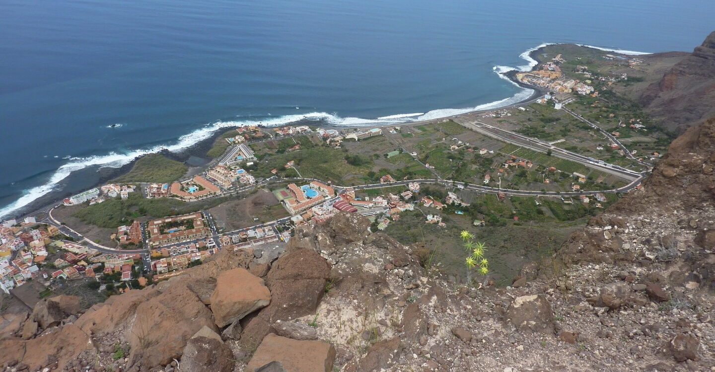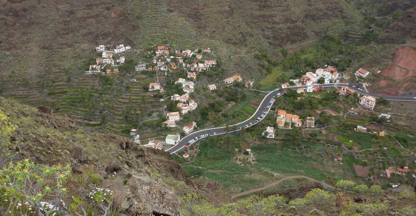 Unsere Wanderung beginnt in El Guro im oberen Valle Gran Rey. So gemütlich, wie die Tour startet, so sportlich wird sie auf dem Lechepfad - einem alten Verbindungsweg zu den Häusern und Feldern auf der Las-Pilas-Hochebene. Gegenüber der konventionellen Route sparte der Bauer auf dieser Route 600 m Entfernung und 110 Höhenmeter. Dafür wird aber die Wanderung zu einem Drahtseilakt oberhalb des Valle Gran Ray. Für unsere Mühen werden wir mit einem herrlichen Panoramaweg und einer grandiosen Aussicht auf den 500 m tiefer liegenden Küstenstreifen des Südteils der Insel belohnt. Bei guter Sicht kann man auch noch die vorgelagerten Inseln El Hierro und im Nordosten Las Palmas ausmachen.