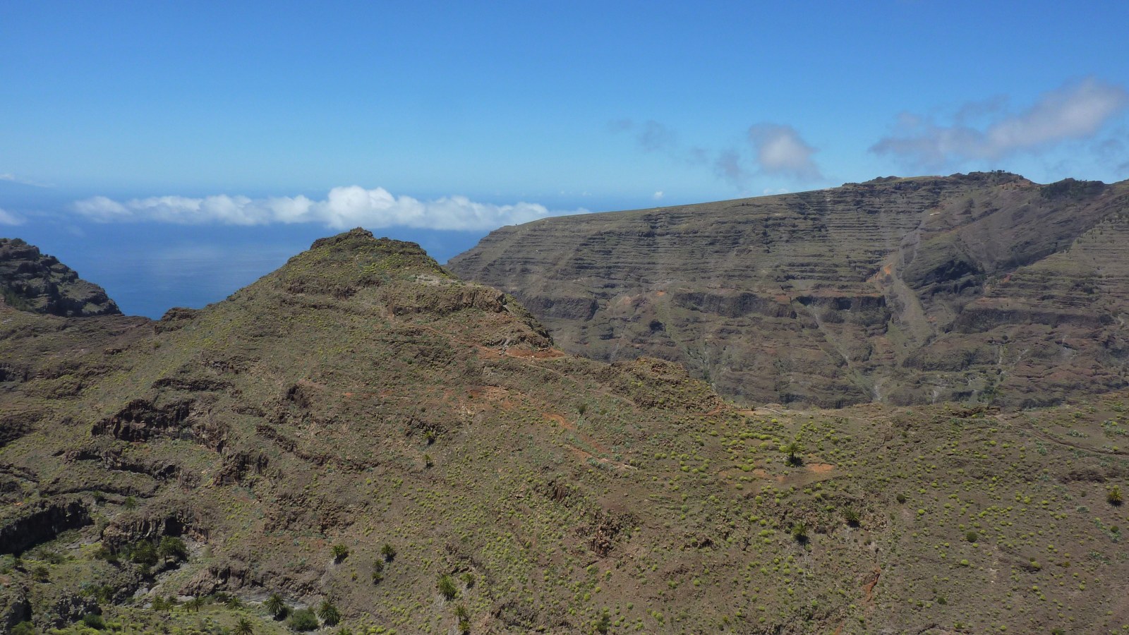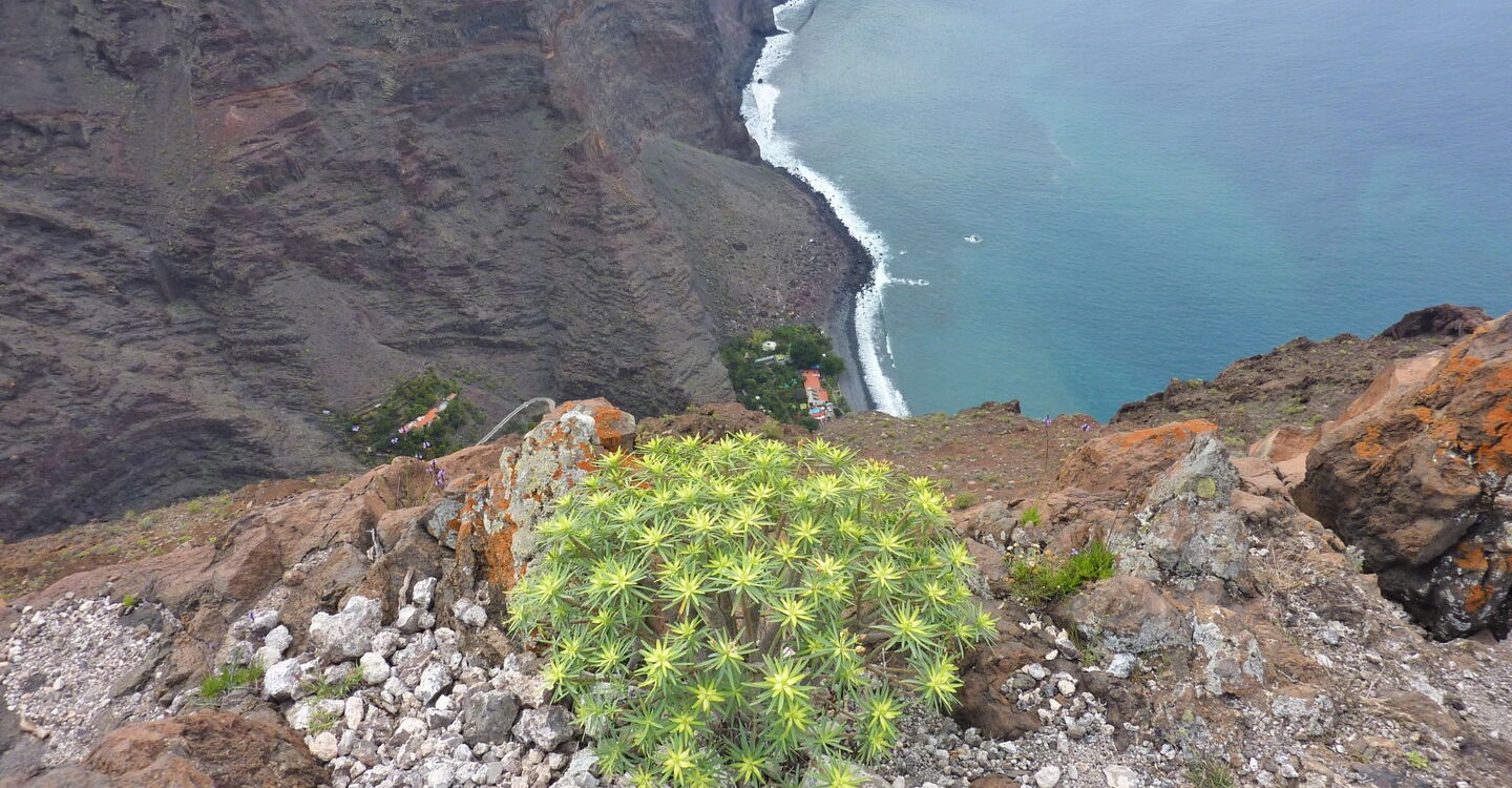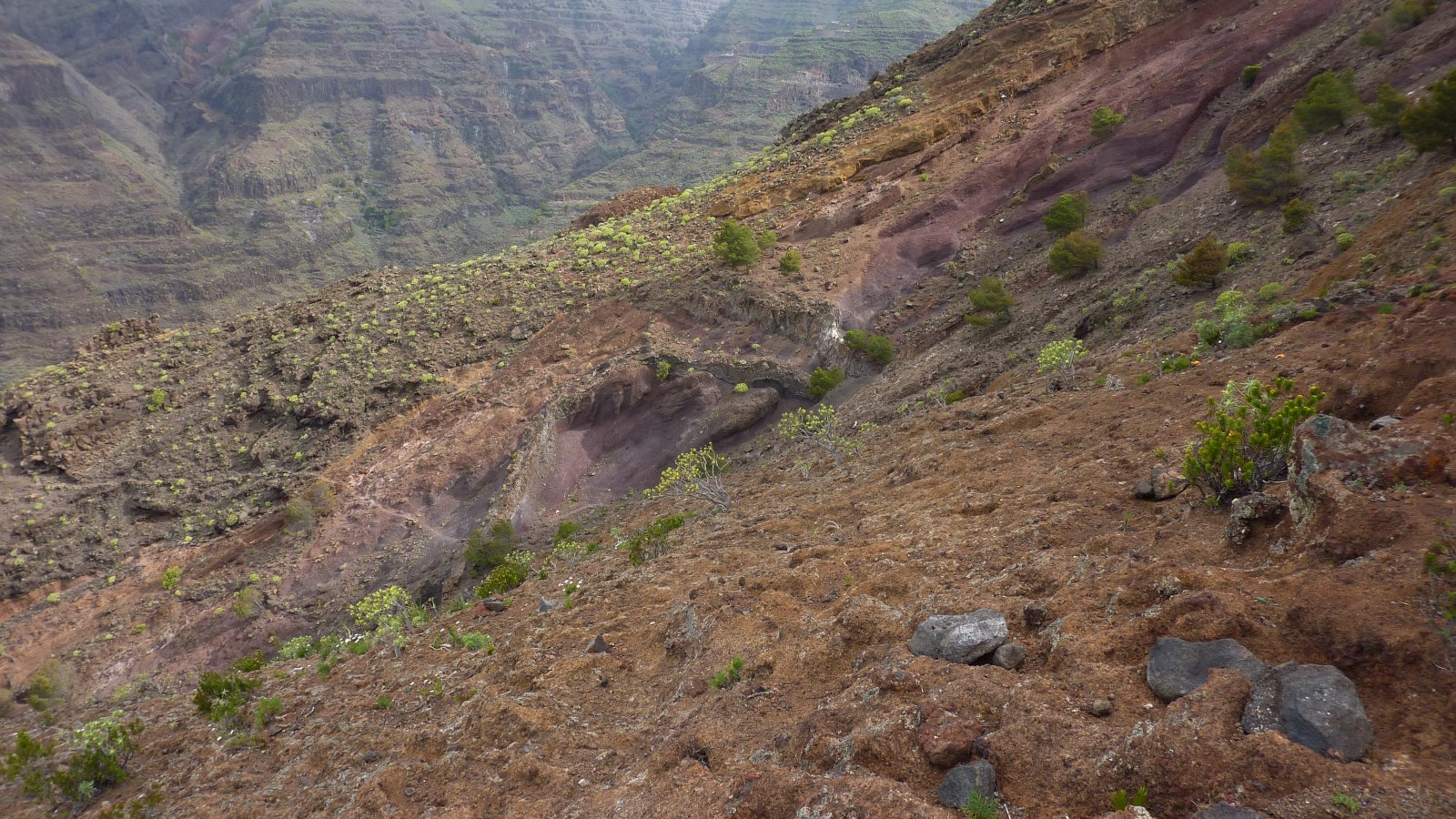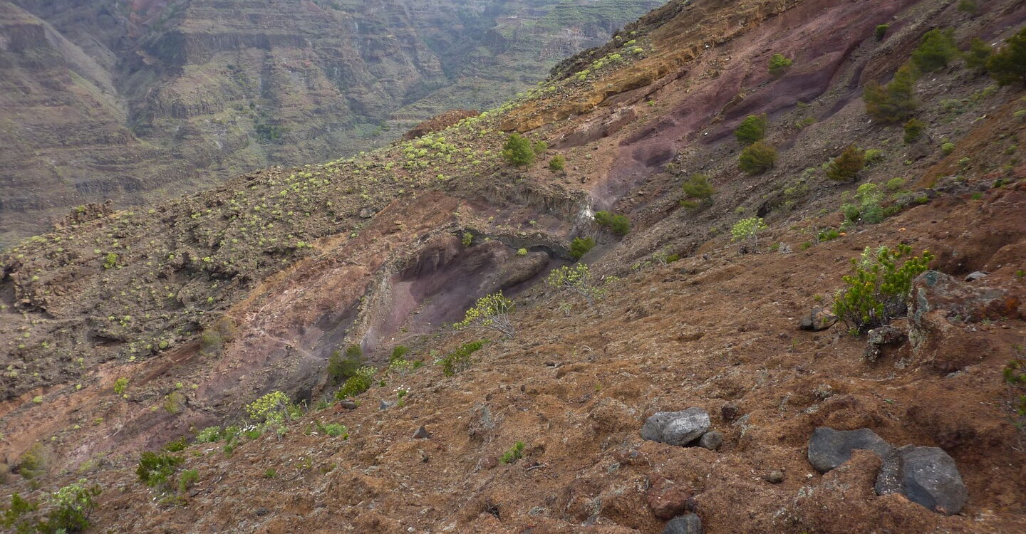 Der Einstieg zum Lechepfad ist nicht einfach zu finden. Nach 500 m stehen wir unterhalb eines großen Felsvorsprungs, der nachfolgende Weg führt in engen Kehren bergauf. Wir treffen auf ein weiß-rotes Kreuz auf einem Stein und einige Meter weiter auf ein durchgestrichenes rot-weißes Kreuz, abgesperrt durch Steine. Hier zweigt rechts der (02) Lechepfad (379 m) ab. Da der Pfad schwer auszumachen ist, sind rote Punkte - aber nur auf dem ersten Drittel des Weges - eine essenzielle Orientierungshilfe. Vereinzelte Steinmännchen markieren zusätzlich den Pfad. Nach einer ockerbraunen Schichtwand überqueren wir einen Bergrücken und haben nun freien Blick auf das untere Valle Gran Ray, bis hin zur Nachbarinsel El Hierro. Auf dem nachfolgenden Stück queren wir eine riesige Erosionsrinne mit einigen grünen Tupfern; das sind Kiefern, die noch nicht in den Abgrund gerissen worden sind.