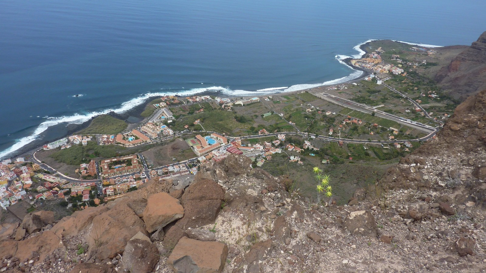 Wir gehen 350 m auf dem gleichen Weg bis zur Einsattelung zurück, um dann links über das Plateau auf einem beginnenden Pfad direkt an den Grat zu gelangen, wo sich uns ein gigantischer (04) Blick in das Valle Gran Rey (590 m) bietet. Auf unserem weiteren Weg gehen wir in gebührendem Abstand oberhalb dieser Klippe bergauf Richtung Las Pilas. Auf dem letzten Stück umlaufen wir den Las Pilas in einer 180-Grad-Kehre, bis wir auf die erste Ruine mit Dreschplatz vom Hinweg treffen.