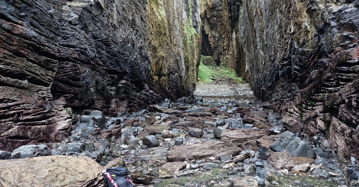 Wir folgen dem weiteren Pfad Richtung Süden entlang der Küste, der zunächst etwas sumpfig ist, sich aber bald verbessert, nachdem er die grasbewachsenen Hänge erklimmt. Windflüchter berichten von windigen Zeiten. Unterhalb des Berges Beinn Leacach führt der Weg steil oberhalb der Klippen entlang. An wenigen Stellen muss man schwindelfrei sein. Es erfolgt der Abstieg in die 04 Schlucht Scaladal (5 m). Hinter der Schlucht steigt der Weg wieder in schwindelerregende Höhen auf.