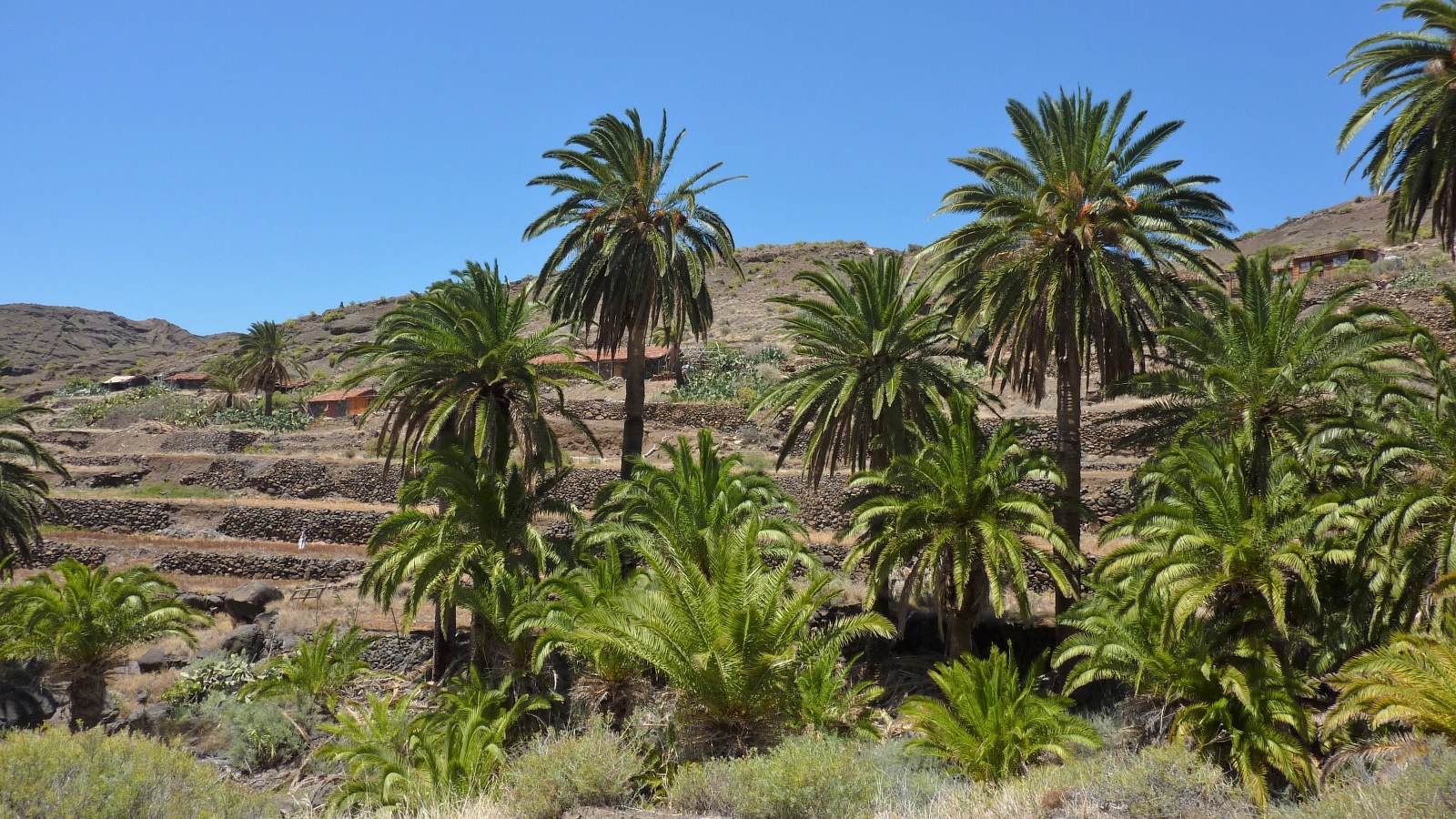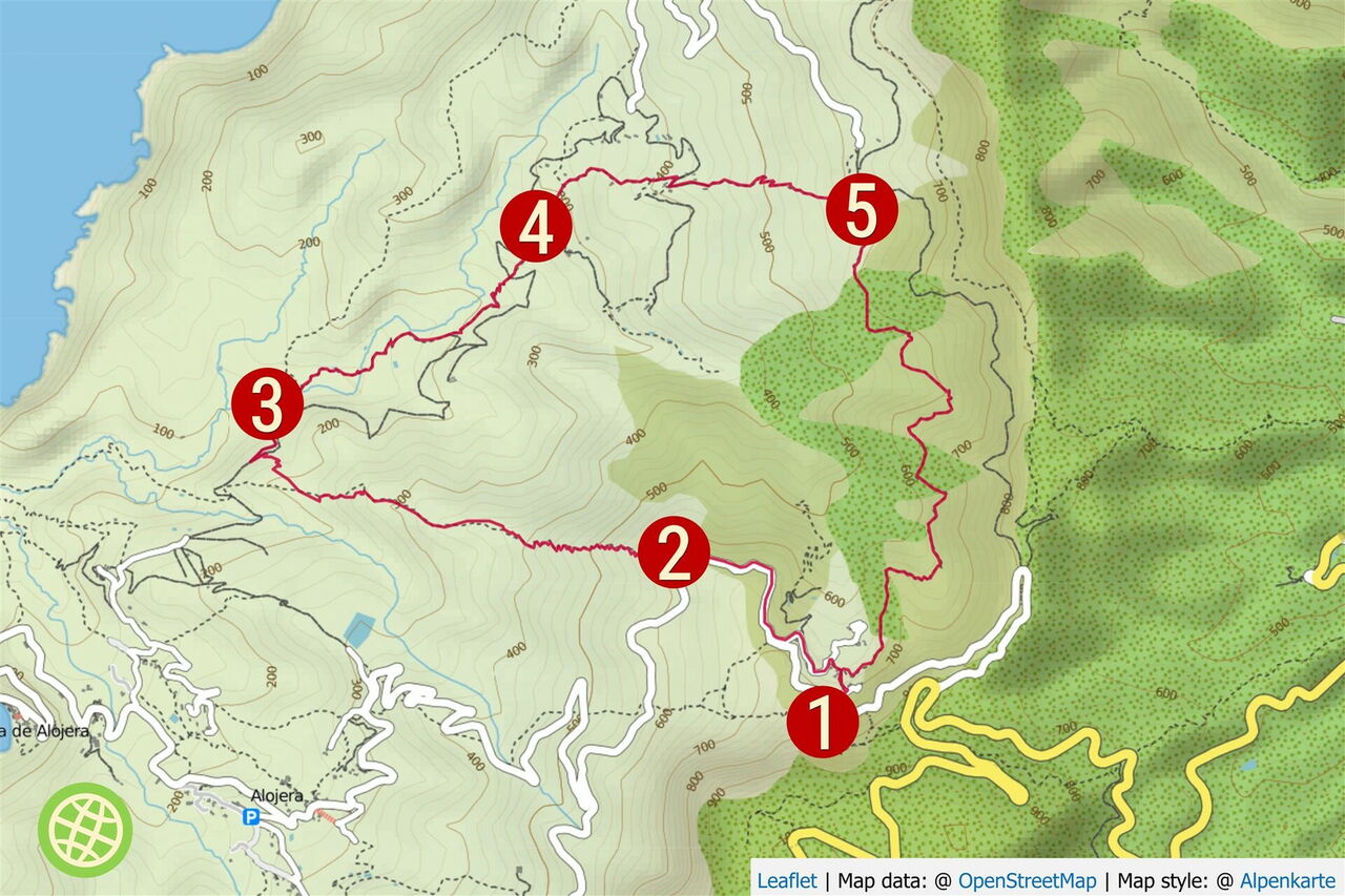 Wenn der Wanderweg endet, gehen wir rechts und folgen fortan der weiß-roten Markierung auf dem vor uns liegenden (05) Höhenwanderweg (592 m). Der Weg wird zunehmend schmaler und in einer Rechtskurve folgen wir dem rechten Abzweiger bergab. Wir laufen durch eine Region, in der der Saft der vielen Dattelpalmen gewonnen und zu Palmsirup verarbeitet wird. Schlussendlich erreichen wir die Ortschaft Epina und gehen auf einem linken Abzweiger den Treppenweg Richtung Alojera. Wir sehen nun das rote Haus, wo wir unser Auto geparkt haben, oder wir gehen links am roten Haus vorbei, um zur Bushaltestelle zu gelangen.