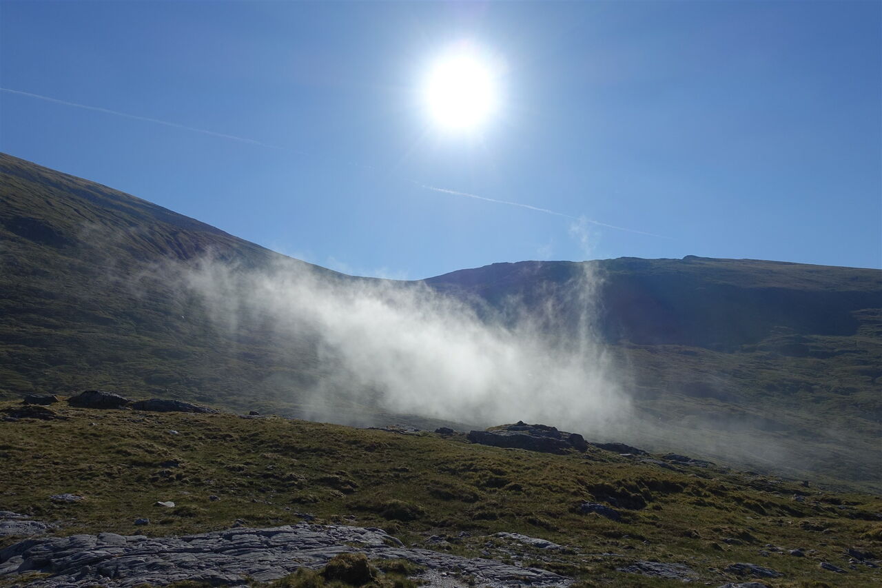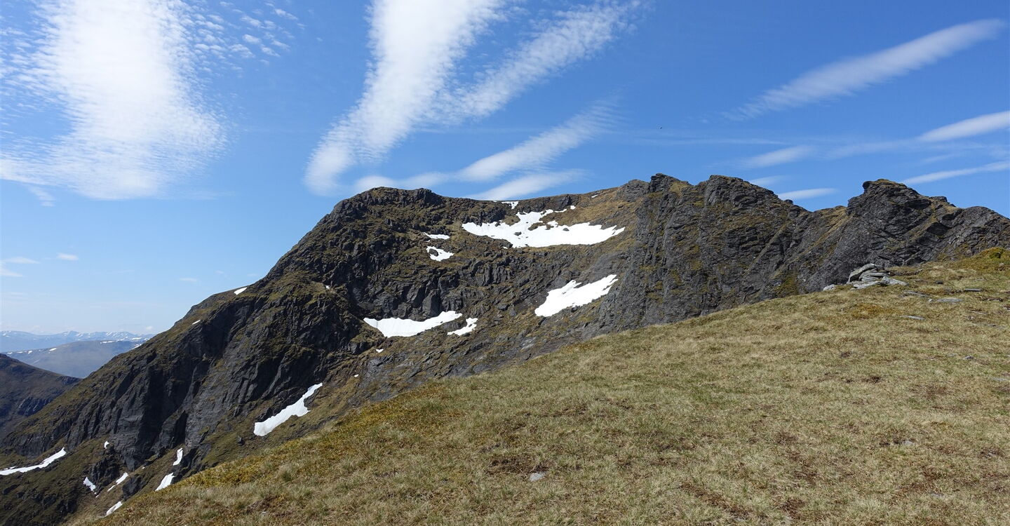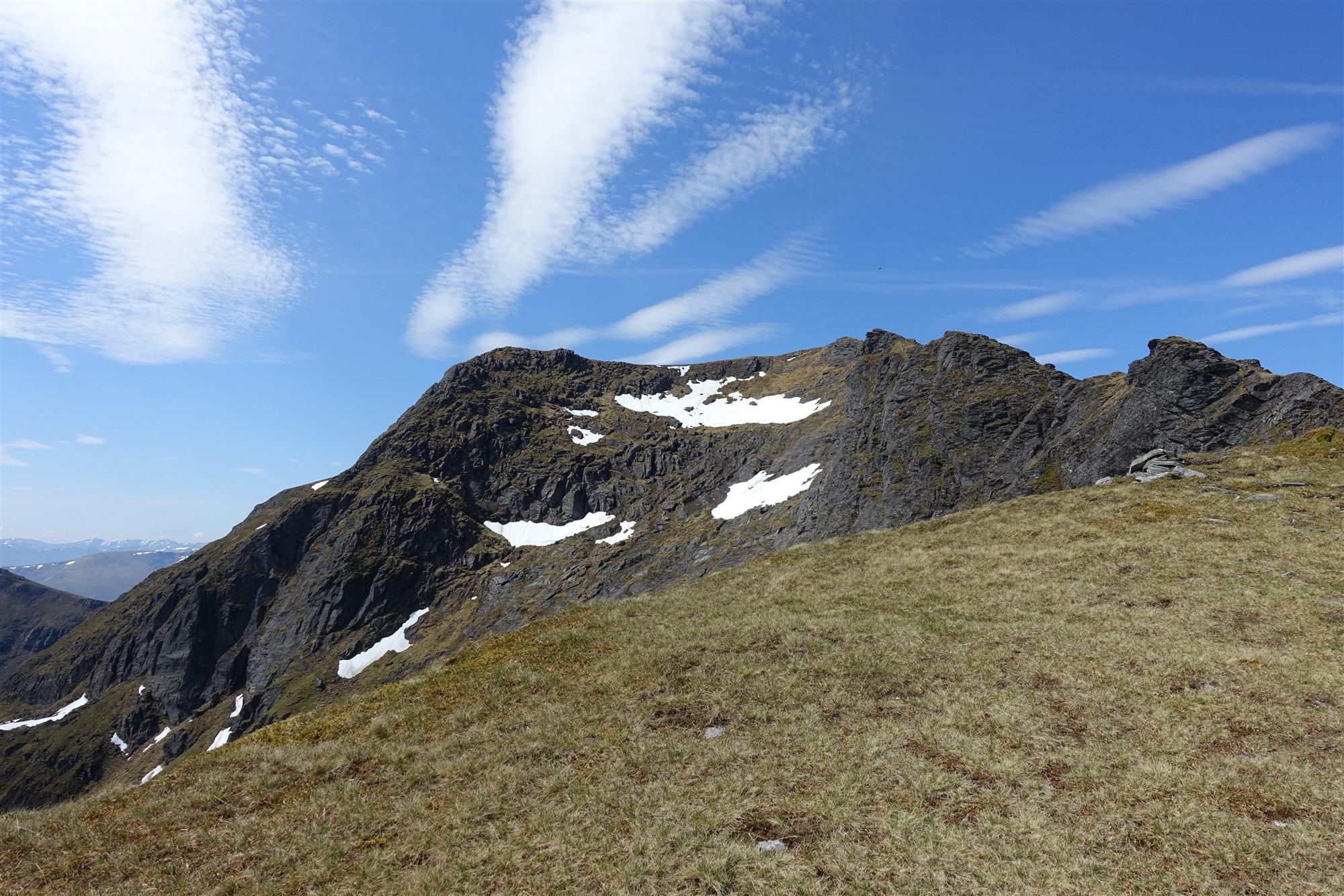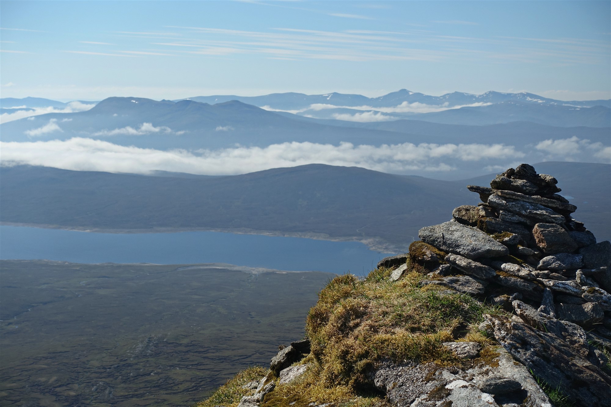 Bei guter Sicht kann man als einen Wegpunkt den riesigen Fels anpeilen. Beim Aufstieg orientiert man sich mehr in Richtung des linken Berghangs, da mittig bis rechts ein Felsband den Aufstieg erschweren würde. Sobald man sich bis auf 100 m dem riesigen Fels genähert hat, quert man den Hang nach halb rechts, um den niedrigsten Punkt der Einsattelung zu erreichen. Von dort folgt man rechts dem Pfad in Richtung des Munros 03 Sgùrr nan Each (923 m). Richtung Süden blickt man auf den Loch Fannich, die Sicht auf die unzähligen Gipfel ist einfach grandios. Richtung Norden lässt sich das markante Bergmassiv des An Teallach mit dem dahinter liegenden Atlantik ausmachen.