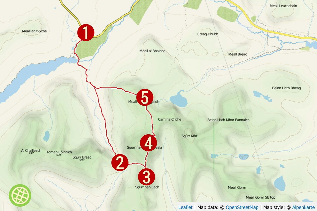 Vom Parkplatz am 01 Start und Ziel (293 m) gehen wir auf der Schotterpiste Richtung Loch Fanninch. Bei der darauffolgenden Wegekreuzung gehen wir dann links über die Brücke und im weiteren Verlauf durch ein kleines Waldstück, um abermals einen breiteren Bachlauf auf einer Fußgängerbrücke zu überqueren. Es folgt ein Abschnitt parallel zu einem weiteren Bachlauf bis zu zwei Steinmännchen, die den auf der anderen Uferseite weiterführenden Pfad markieren. Es folgt ein langer und kontinuierlicher Aufstieg durch ein lang gezogenes Tal. Auf halber Strecke bis zur nachfolgenden Einsattelung kommen wir an einer Ruine vorbei.