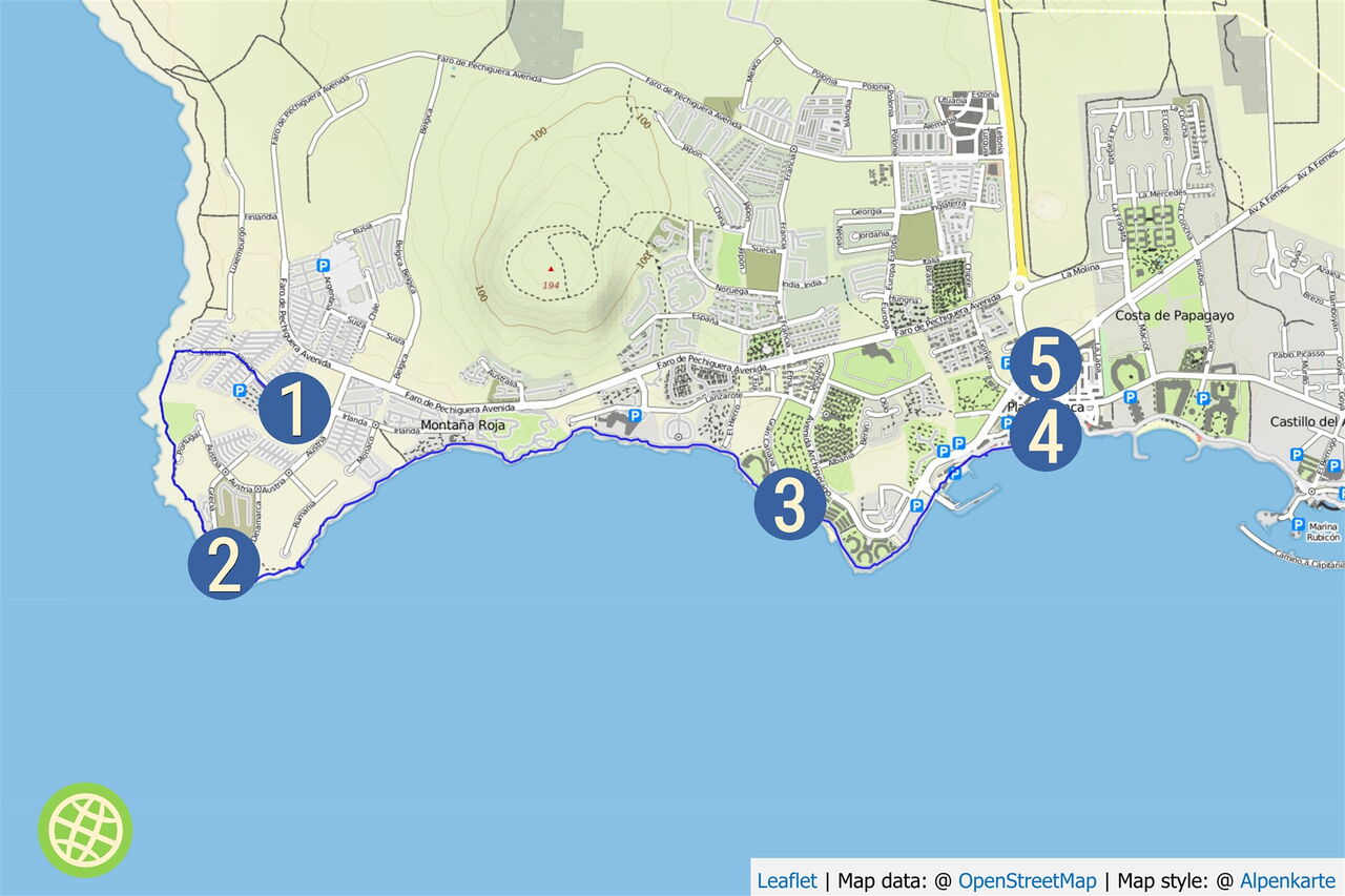 Möchten Sie einmal die Region der Playa Blanca, westlich vom Hafen, erkunden? Dann ist dieser Promenadenspaziergang entlang des Ferienzentrums genau richtig. Bequem fahren wir mit dem Bus zum Start. Von dort spazieren wir vorbei an Villen und Residenzen, Apartmentanlagen, zwei Leuchttürmen und unzähligen Hotels. Vorbei geht es auch an zwei kleineren Stränden - natürlich mit Badegelegenheit - und der künstlich angelegten Playa Flamingo, bis kurz nach dem Hafen die Playa Blanca erreicht ist und es nur noch wenige Meter bis zum Ausgangspunkt sind.