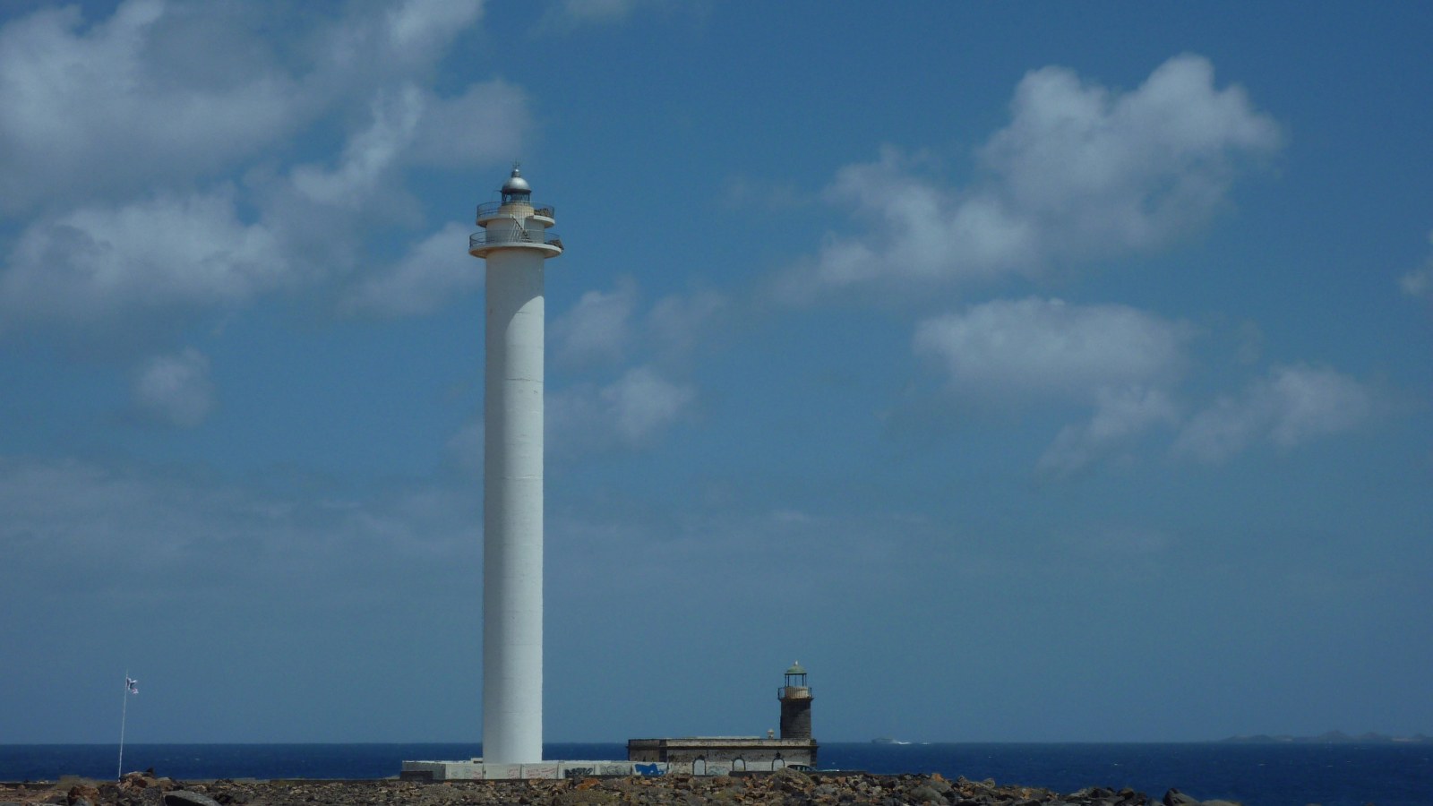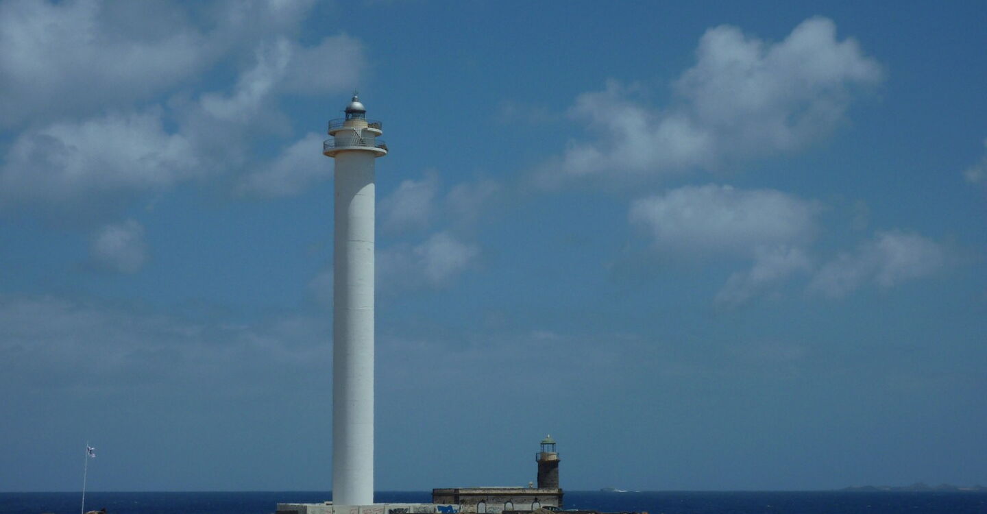 Bereits hinter dem ersten Häuserblock endet der Promenadenweg und es geht auf einem Schotterpfad, vorbei an einem zweiten Häuserblock, bis zum Leuchtturm (02) Faro Pechiguera (10 m). Er liegt an der Meeresenge La Bocayna, die Lanzarote von ihrer Nachbarinsel Fuerteventura trennt, an der äußersten Südwestspitze von Lanzarote. Der alte und der neue Leuchtturm stehen direkt nebeneinander. Der 1866 eingeweihte Leuchtturm hatte ein permanentes, 12 Meilen weit sichtbares Leuchtfeuer und war rund 120 Jahre lang in Betrieb. Er wurde aus Basaltstein erbaut und erreicht eine Höhe von 10 m. Heutzutage ist die Einrichtung natürlich außer Betrieb, denn sie wurde durch den 1986 erbauten, 50 m hohen Leuchtturm ersetzt. Für die Wanderung entlang des Leuchtturms gibt es verschiedene Varianten, aber wenn man sich immer so dicht wie möglich am Meer hält, erreicht man schon bald wieder einen Weg entlang der Promenade.