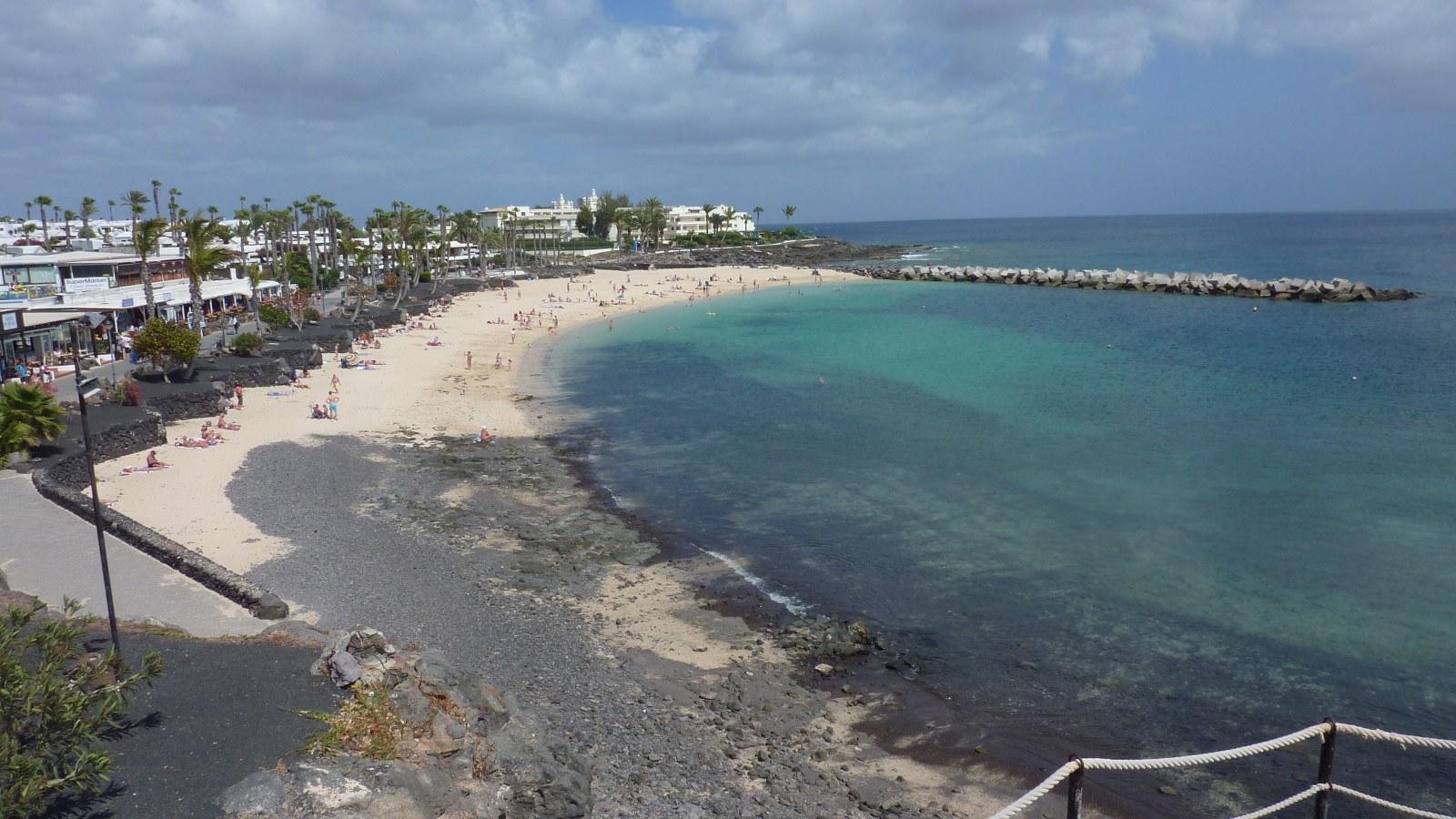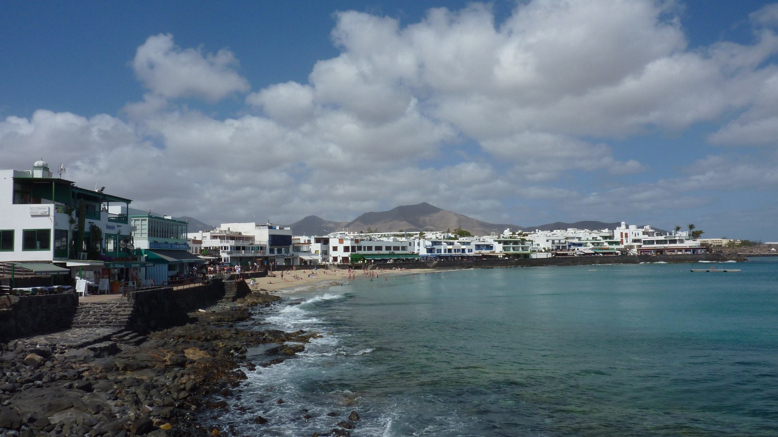 Wir passieren ein weiteres großes Hotel, das Iberostar Lanzarote Park, bis es vorbei am Hafen in die Fußgängerzone geht. Schlussendlich treffen wir auf die im Zentrum liegende (04) Playa Blanca (7 m). Dieser kleine weiße Sandstrand, direkt an der Promenade, hat dem ganzen Ort seinen Namen gegeben. Wer mag, kann sich hier sonnen, baden gehen und dann in einem der vielen Fischrestaurants essen.