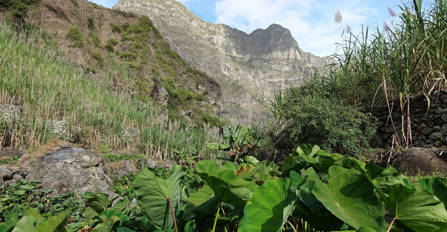 Eine interessante Variante zu der meist gegangen Route (siehe Tour 27) der Insel, mit immerhin 1500 Höhenmetern bergab, beschreibt diese Rundwanderung. Sie nimmt uns mit in die einmalige Kulturlandschaft des Figueiral de Paúl , entlang von Zuckerrohrplantagen, Bananenplantagen und den vielen Terrassenfelder mit Yamswurzelgewächsen. Wir bestaunen die künstlerisch angelegten Bewässerungssysteme. Von einem faszinierenden Aussichtsberg schaut man bis zum Talschluss, dort erheben sich hinter der Steilwand des Cabo da Ribeira die bewaldeten Felsspitzen des Vulkankraters Cova de Paúl. Richtung Schluchtauslauf sieht man das Dorf Vila das Pombas und dahinter den Atlantik. Das ganze Szenario ist von bis zu 1000 m hohen, umliegenden Berggipfeln eingefasst. Das therapeutische Plätschern des omnipräsenten Wassers ist unser Begleiter auf dem Abstieg.