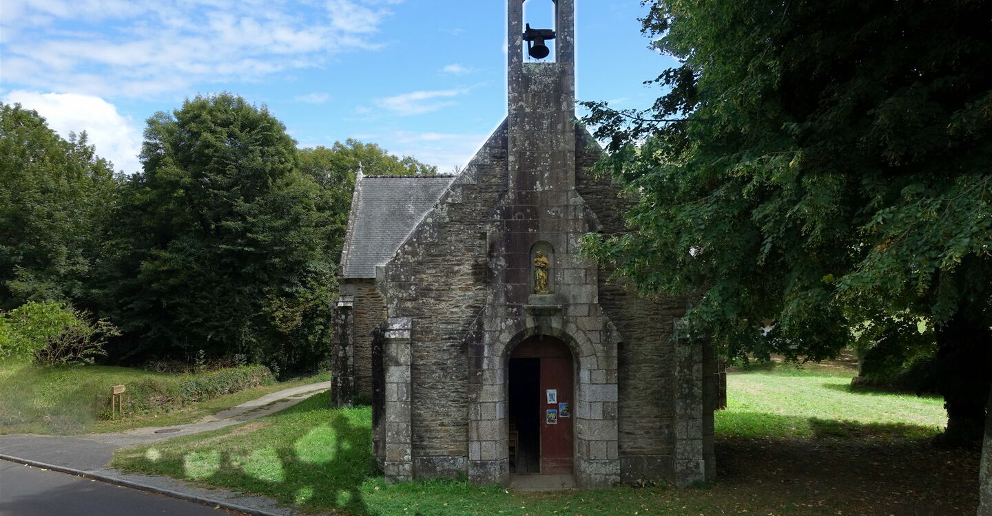 Hinter einem Informationsschild über die Vogelwelt und bei einem hölzernen Wegweiser gehen wir halb rechts bergauf und erreichen die im 16. Jahrhundert erbaute, im 19. Jahrhundert verfallene und 1865 wieder aufgebaute 03 Chapelle Notre-Dame-de-Lanriot (7 m). Die grün getäfelte Decke erinnert an die Form der Schiffsrümpfe und tatsächlich ist die Kapelle der Schutzpatronin der Seefahrer, der Jungfrau Maria, gewidmet. Wir steigen die wenigen Meter zum Nebenarm des Flusses wieder herunter und setzen den Weg fort, bis wir nach einer Holzbrücke landeinwärts gehen, also rechts bergauf. Nach kurzem, aber steilem Aufstieg überqueren wir die Straße nach halb rechts und laufen ein kurzes Stück auf einem Pfad, um dann den Weg auf der Asphaltstraße, der Cheminde la Riviére, fortzusetzen, bis sie endet.