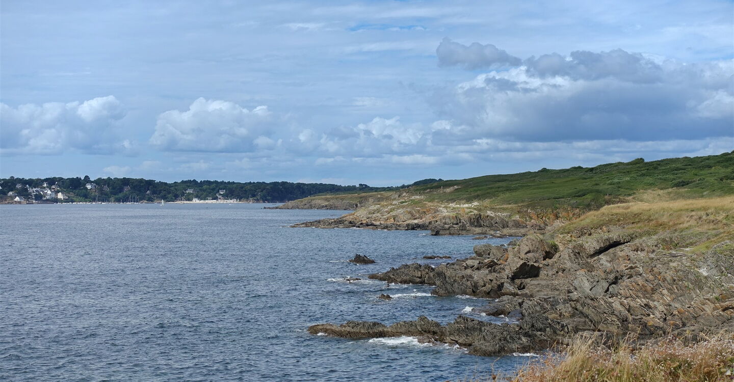 Vor der weißen Mauer gehen wir links und bei der nächsten Möglichkeit rechts in die Rue de Centre. Kurz hinter der nächsten Linkskehre der Straße und einem Holzpfeiler biegen wir halb rechts auf einen Pfad ab, gehen entlang der Überreste einer Steinmauer und biegen bei einer Weggabelung nicht halb rechts ab. Dort, wo der Weg endet, gehen wir rechts über platt geschliffene Steine. Bei der sofort darauffolgenden Weggabelung gehen wir halb links und ignorieren den nächsten linken Abzweiger. Der Pfad geht in eine Fahrspur über, die an einer Straße endet. Wir gehen 115 m bis zur Hauptstraße vor und dort rechts, um 30 m hinter dem Ortsschild Kerduel die Straße nach links zu queren und auf einem Feldweg entlang einer weißen Mauer zu wandern. Es folgen zahlreiche Wegpunkte: Es geht durch ein kleines Waldstück, von rechts mündet eine Einfahrt in unseren Weg. Sobald wir das Meer in der Ferne ausmachen können, endet unser Weg, hier gehen wir rechts. Bevor man in einen Wald eintritt, geht es auf einem schwach ausgeprägten Pfad links am Feldrand entlang. Der Weg führt durch eine Rechts- und eine Linkskehre entlang der Felder. Bei einer perfekt geschnittenen Thujenhecke biegen wir halb rechts ab und gehen nun direkt auf das Meer zu. Wir haben den Fernwanderweg 04 GR 34 (12 m) erreicht und gehen nun in nordwestlicher Richtung.