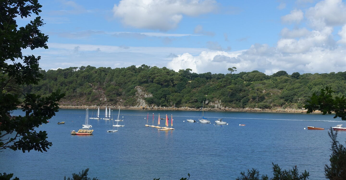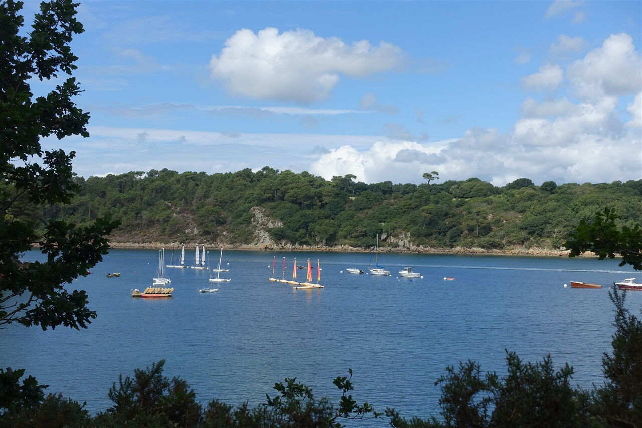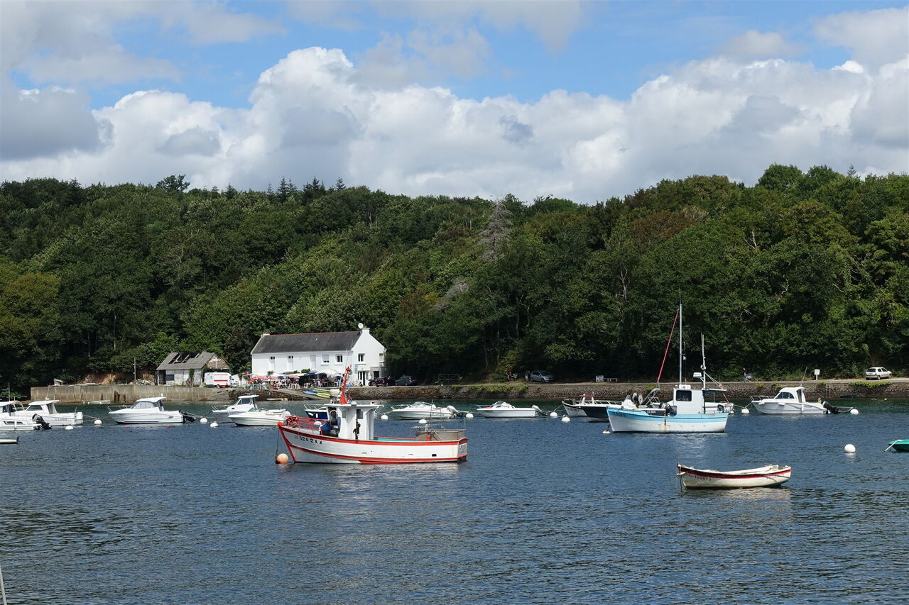 Nach einigen Metern bergab entlang eines grünen Geländers ist der 02 Port du Belon (1 m) erreicht. Wir befinden uns nun direkt an dem Austernfluss, der Wiege der flachen Auster Belon. Die einmalige und besondere Landschaft wurde schon von vielen Malern verewigt. Jeden Tag erreichen Fischerboote den kleinen Hafen, dann werden Meeresfrüchte am Pier verkauft. Auf dem Fußweg entlang der Straße gehen wir bis zu einem linken Abzweiger vor, hier geradeaus und nach 80 m auf der Straße gehen wir links zwischen der Steinmauer hindurch und gelangen zu einem malerisch gelegenen Nebenarm des Flusses.