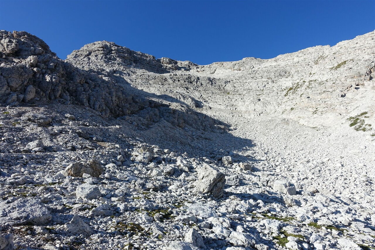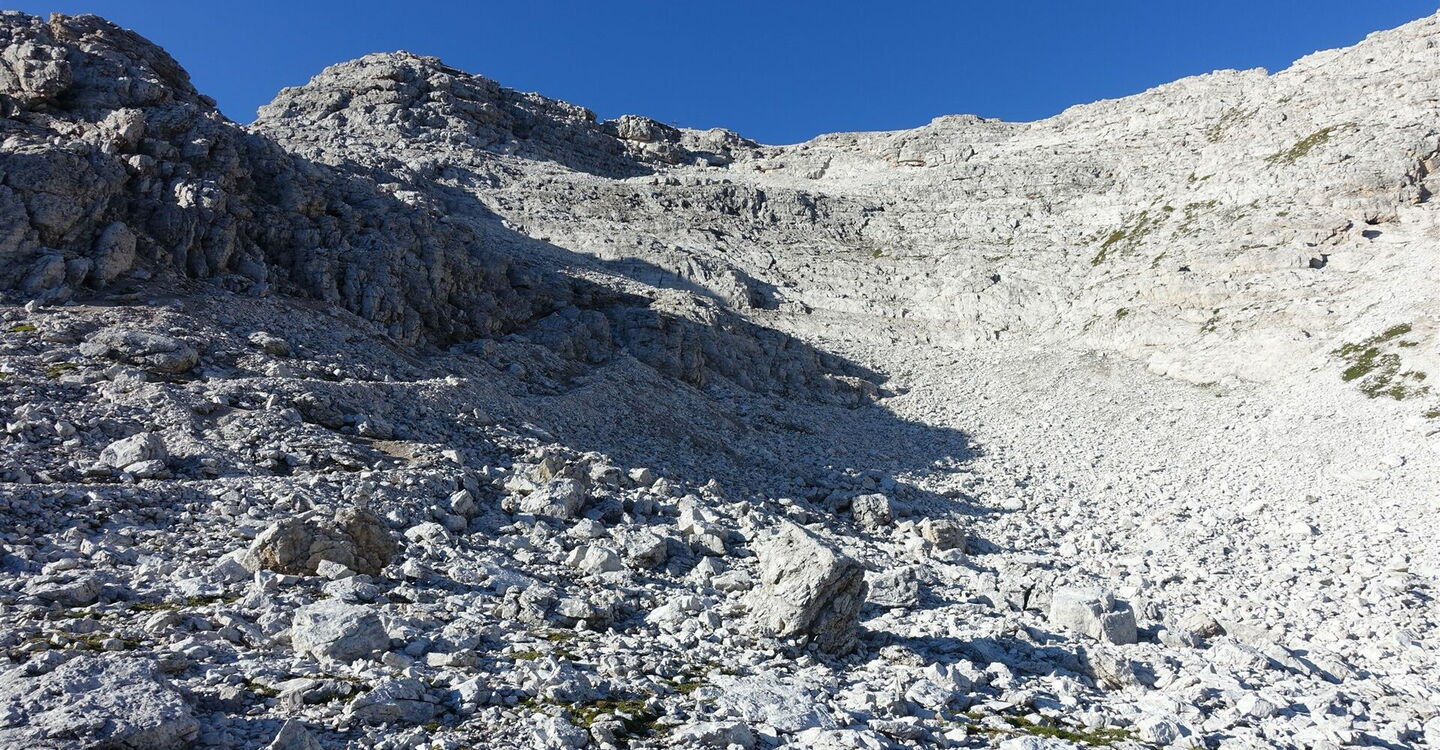 In dem nachfolgenden gerölligen Hochkar führen verschiedene Pfade zum 05 Monte Averau (2.684 m). Der Abstieg zur Forcella Nuvolau erfolgt auf der Aufstiegsroute.