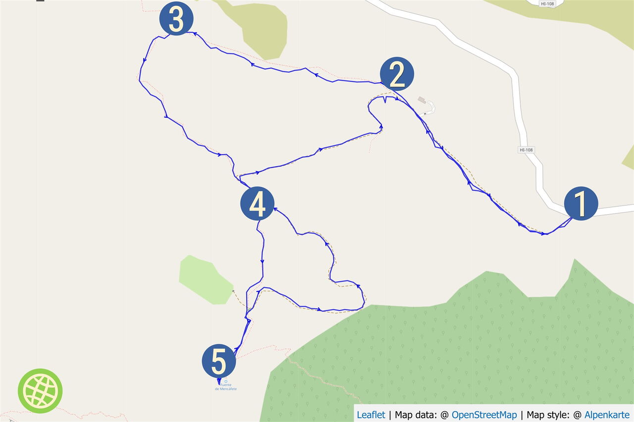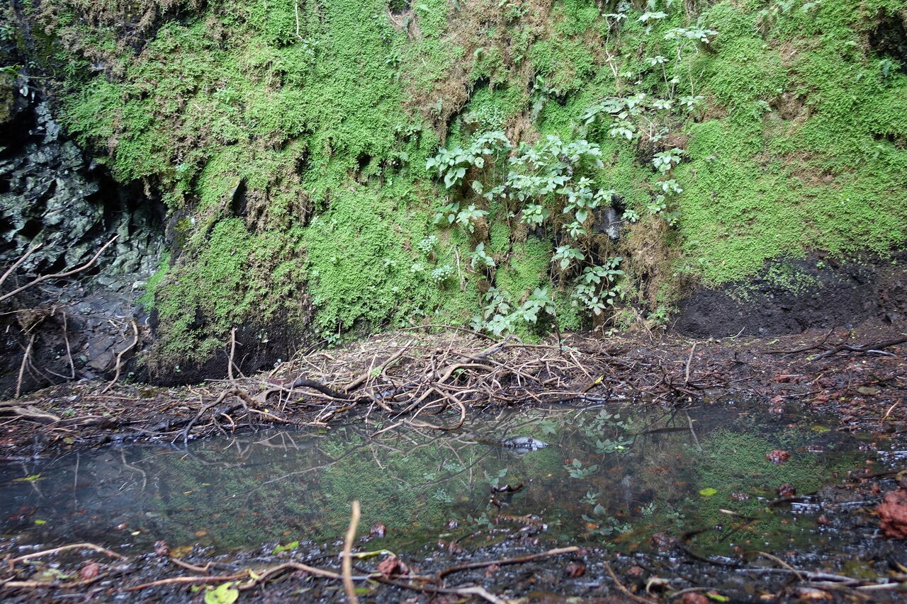 Unterhalb von kräftig grün bewachsenen Felsen verjüngt sich der Pfad. Wir erreichen einen 20-25 m hohen Wasserfall, die (05) Fuente de Mencafete (1000 m). Beeindruckend ist die Ruhe an diesem Ort, nach langen Trockenperioden hört man nur das Geräusch von tropfendem Wasser – der Wasserfall führt kein Wasser mehr. Geht man auf dem gesicherten Weg weiter bergauf, so erreicht man zwei angelegte Wasserreservoirs. Sind diese gefüllt, so wird das überlaufende Wasser zu einem riesigen Reservoir weitergeleitet, welches man über einen etwas rutschigen Treppenweg erreicht. Auch befinden sich am Wegesrand aus Stein gemeißelte Wassertröge. Vergleicht man diese verborgene Welt mit ihrer üppig grünen Vegetation mit dem wüstenähnlichen Klima von La Restinga, das nur 6,5 km entfernt liegt, so kann man diesen Kontrast kaum verarbeiten. Auf dem Rückweg gehen wir auf der Schotterpiste bis zum Ausgangspunkt zurück.