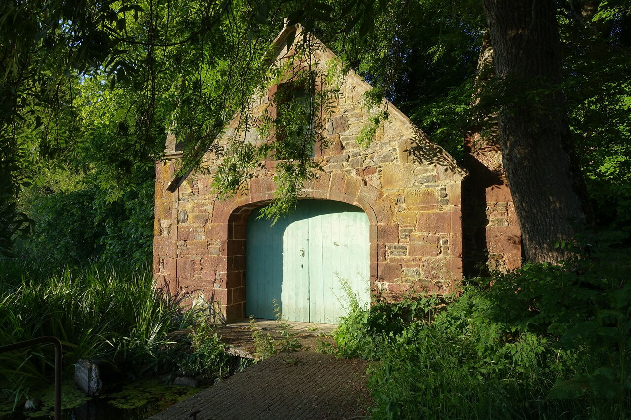Hinter dem zweiten Torbogen gelangen wir an das gegenüberliegende Ufer vom Hinweg und kurz später an das alte 05 Bootshaus (50 m). Hinter einer Vogelbeobachtungshütte queren wir eine Straße und gehen nun auf einem Waldpfad, parallel zum Hinweg, bis dieser in die Straße mündet und wir auf dem bekannten Hinweg zurückgehen.